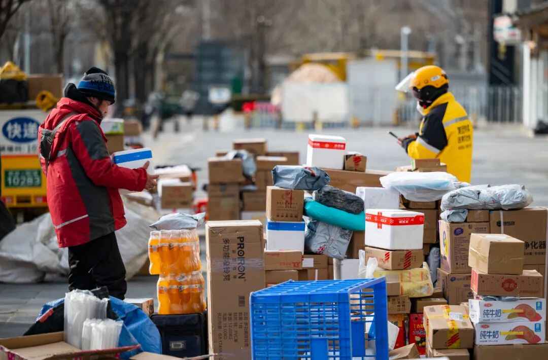 北京市朝阳区望京街道的一个居民小区外,快递员正在整理清点快件 图源:视觉中国