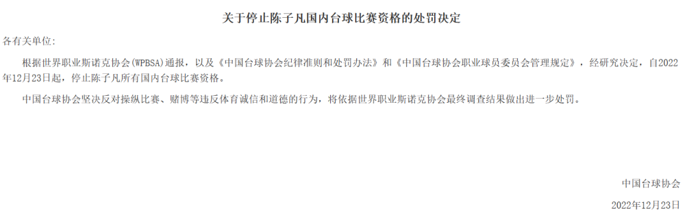 中国台球协会在声明中表示,根据世台联通报,以及《中国台球协会纪律准则和处罚办法》和《中国台球协会职业球员委员会管理规定》,自2022年12月23日起,停止陈子凡所有国内台球比赛资格。