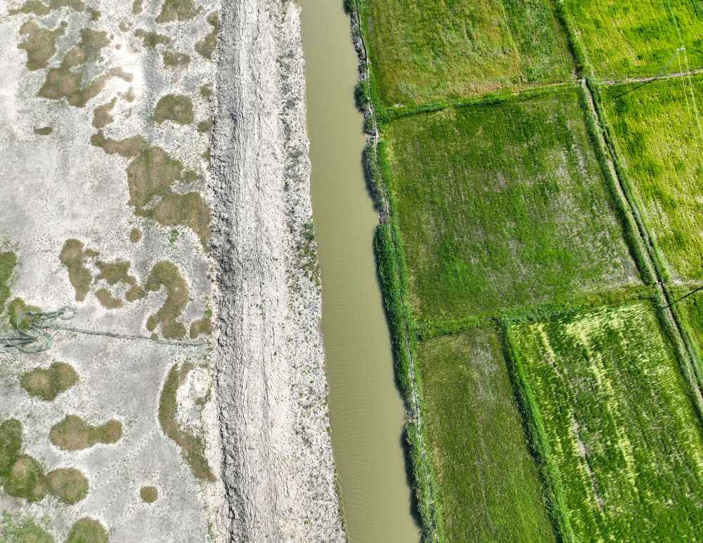 这是2022年7月12日拍摄的吉林省白城市镇赉县的稻田(右)与盐碱滩涂(无人机照片)。新华社发(潘晟昱 摄)