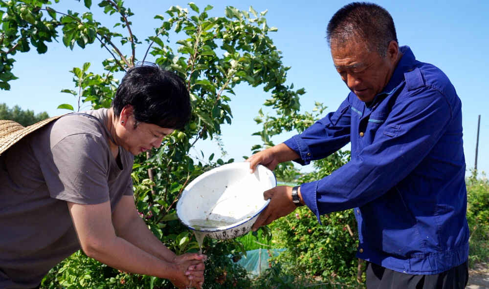 2022年7月12日,从稻田干完农活归来,孟庆江(右一)为妻子张瑞平(左一)倒水洗手。新华社记者 王帆 摄
