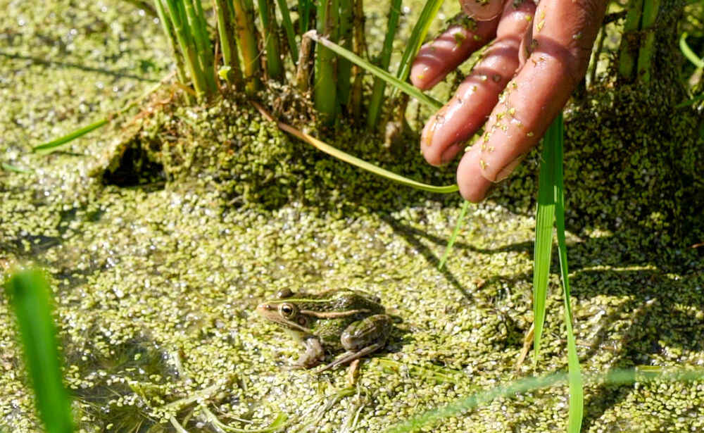 这是吉林省白城市镇赉县庆江种养殖农民专业合作社有机稻田中的青蛙(2022年7月12日摄)。新华社记者 王帆 摄