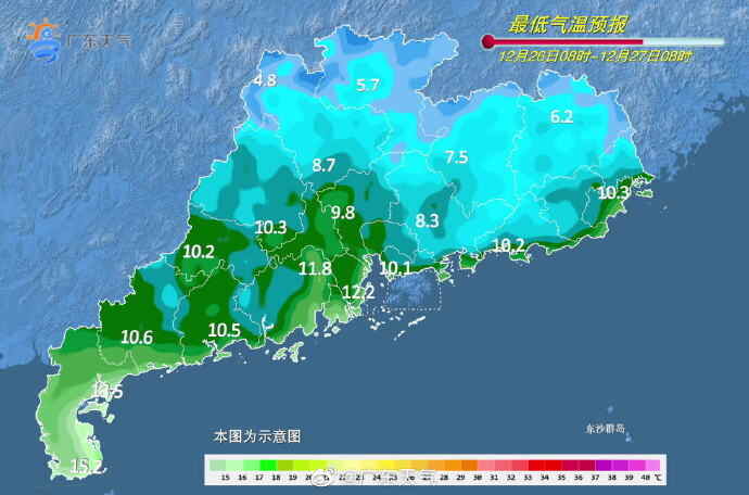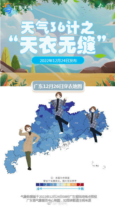 26日,广东晴间多云,最低气温:粤北和珠江三角洲北部市县3℃~6℃(高海拔山区0℃~2℃),部分市县有霜(冰)冻,粤西和珠江口附近市县9℃~12℃,其余市县6℃~9℃。