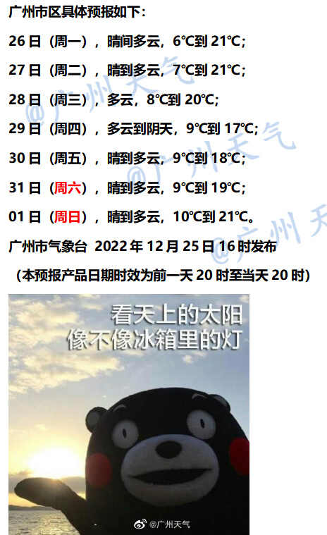 但这样的晴天马上就会被“阿冷”打断。据预测,28日起会有新一股冷空气影响广东,气温略降,粤北及珠三角北部地区到时要注意防寒保暖哦。