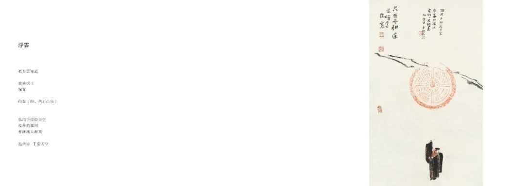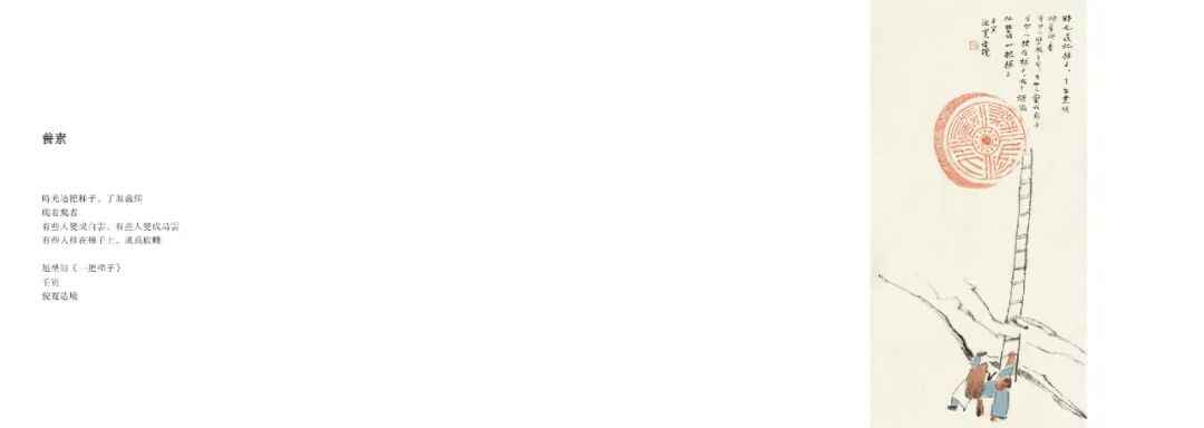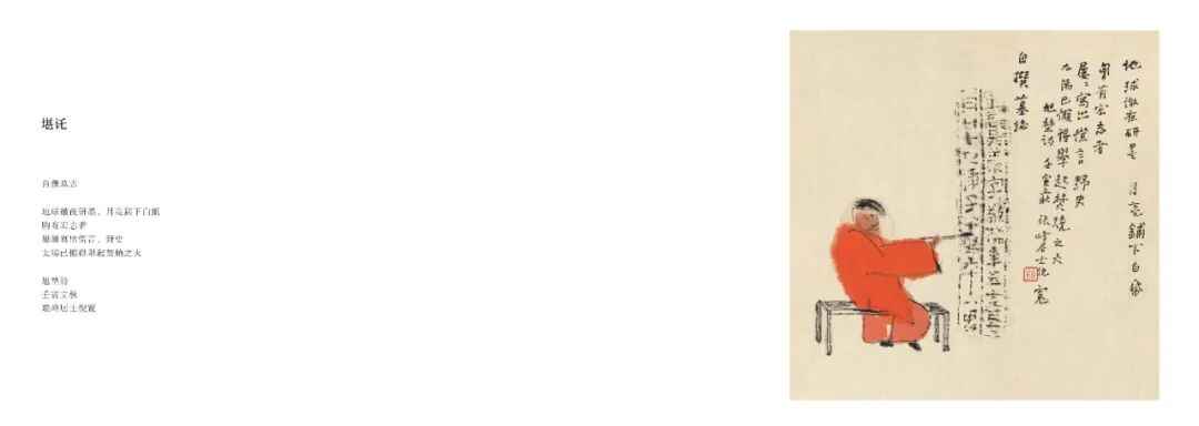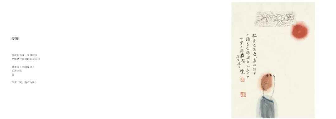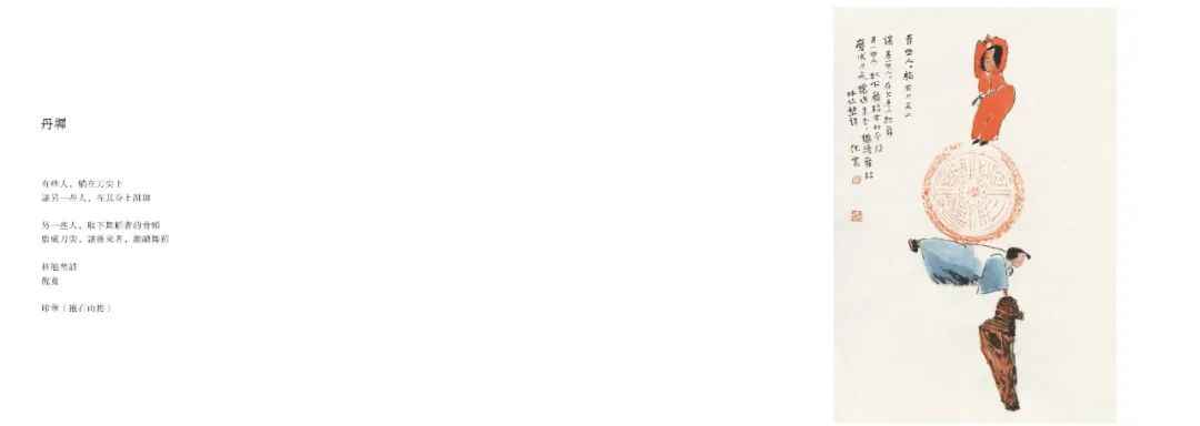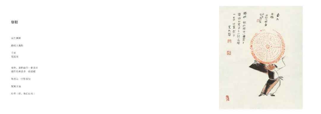 瓦当、砖文等拓片作为古建筑的艺术图腾,被作者置入现代事物之间,布排之间留白生韵,相映相生,浑然天成。瓦当拓片“长生无极”题写不烂的石头,可以是泰山石敢当式的勇当一方的《安泰》;题写一指禅和舞蹈的人像,则成为背负或脚踏的风火轮,艺术家以跳脱于世外的全视角,俯瞰《丹墀》之下载重或高蹈之人生。意象在其中互通转换,负重与轻舞之间,既似配诗所寄寓之风水流转,也似太极之阴阳,实乃天地间万物之无极无限,生生不息。