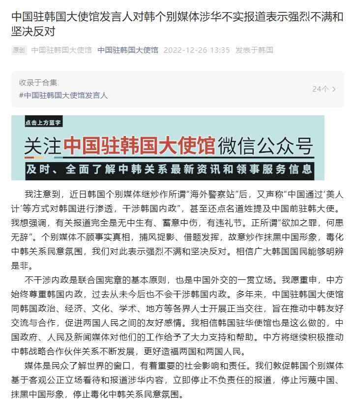 中国驻韩国大使馆发言人表示,近日韩国个别媒体继炒作所谓“海外警察站”后,又声称“中国通过‘美人计’等方式对韩国进行渗透,干涉韩国内政”,甚至还点名道姓提及中国前驻韩大使。我想强调,有关报道完全是无中生有、蓄意中伤,有违礼节。正所谓“欲加之罪,何患无辞”。个别媒体不顾事实真相,捕风捉影、借题发挥,故意炒作抹黑中国形象,毒化中韩关系民意氛围,我们对此表示强烈不满和坚决反对。相信广大韩国国民能够明辨是非。