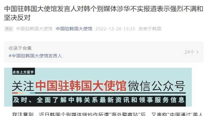 据微信公众号“中国驻韩国大使馆”12月26日消息,中国驻韩国大使馆发言人对韩个别媒体涉华不实报道表示强烈不满和坚决反对。