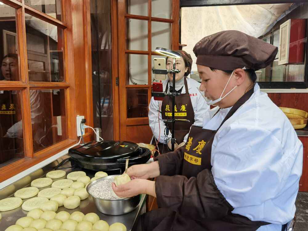在平遥古城庆义泉炉食铺内,工人们忙着打月饼、直播卖货(2022年1月25日摄)。新华社记者 王学涛 摄