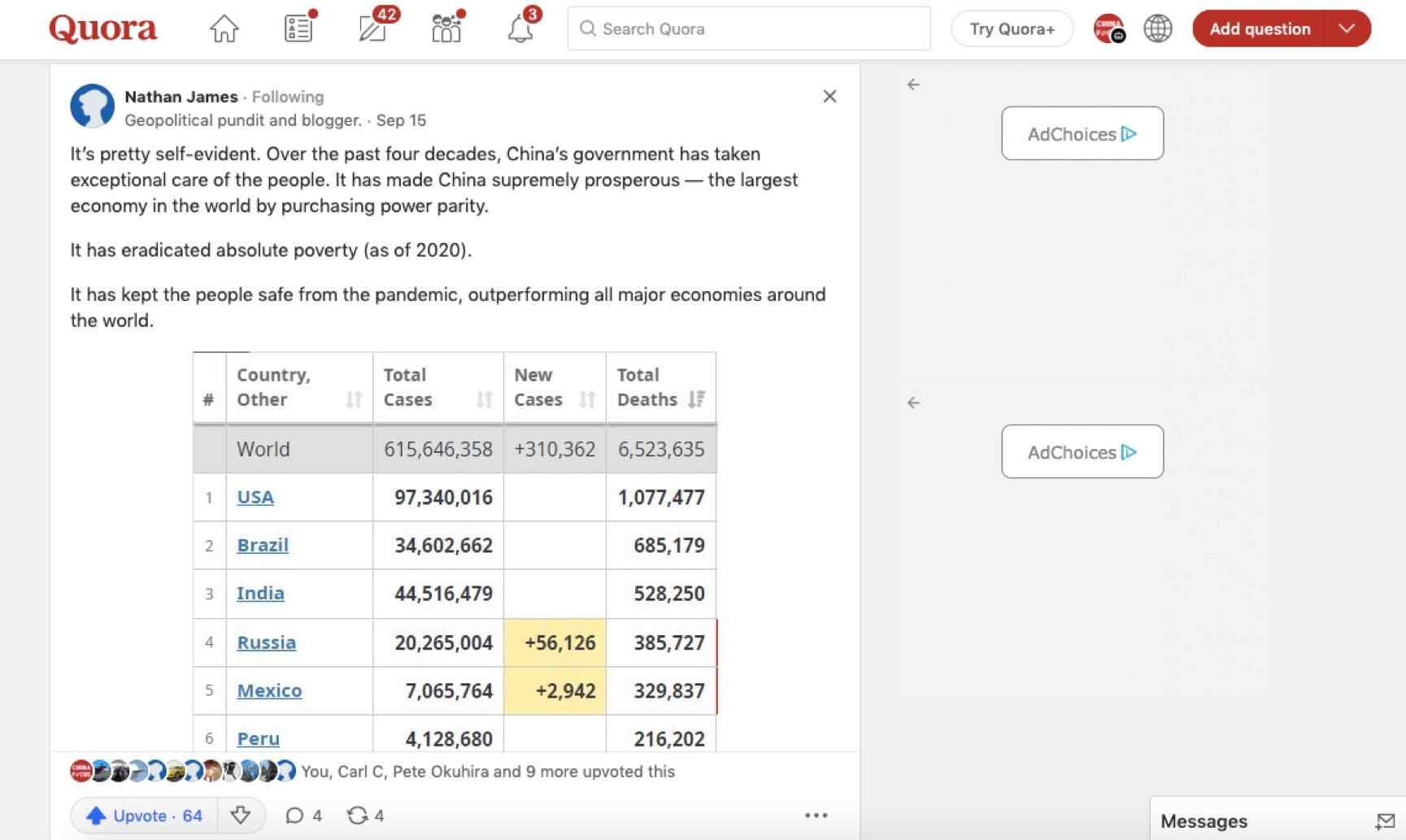 Quora平台China Focus提问“中国人民对中国政府为何能保持很高的满意度?”相关回答截图