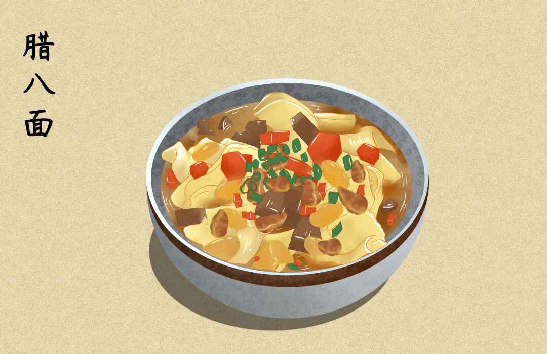 腊八面流行于关中地区。“ 红白萝卜似疙瘩,母亲叫你吃腊八” 讲的就是腊八面的做法。做腊八面之前先要做好 “腊八菜”,也叫“腊八臊子”。“腊八菜”是先将红萝卜、白萝卜、白菜帮子切成薄匀适当的菱形、长条、方片(也就是俗语中的“疙瘩”),然后以大葱、蒜苗、豆腐、粉条、茴香等调料通过文火烩在一起,浇上红艳艳的油泼辣子。
