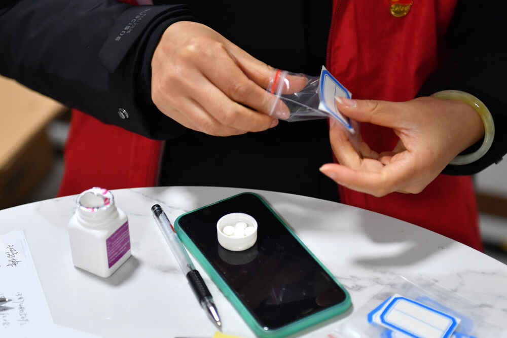 12月29日,在长沙市天心区文源街道天鸿社区的快递外卖小哥“红色之家”,工作人员分装药品。新华社记者陈振海 摄