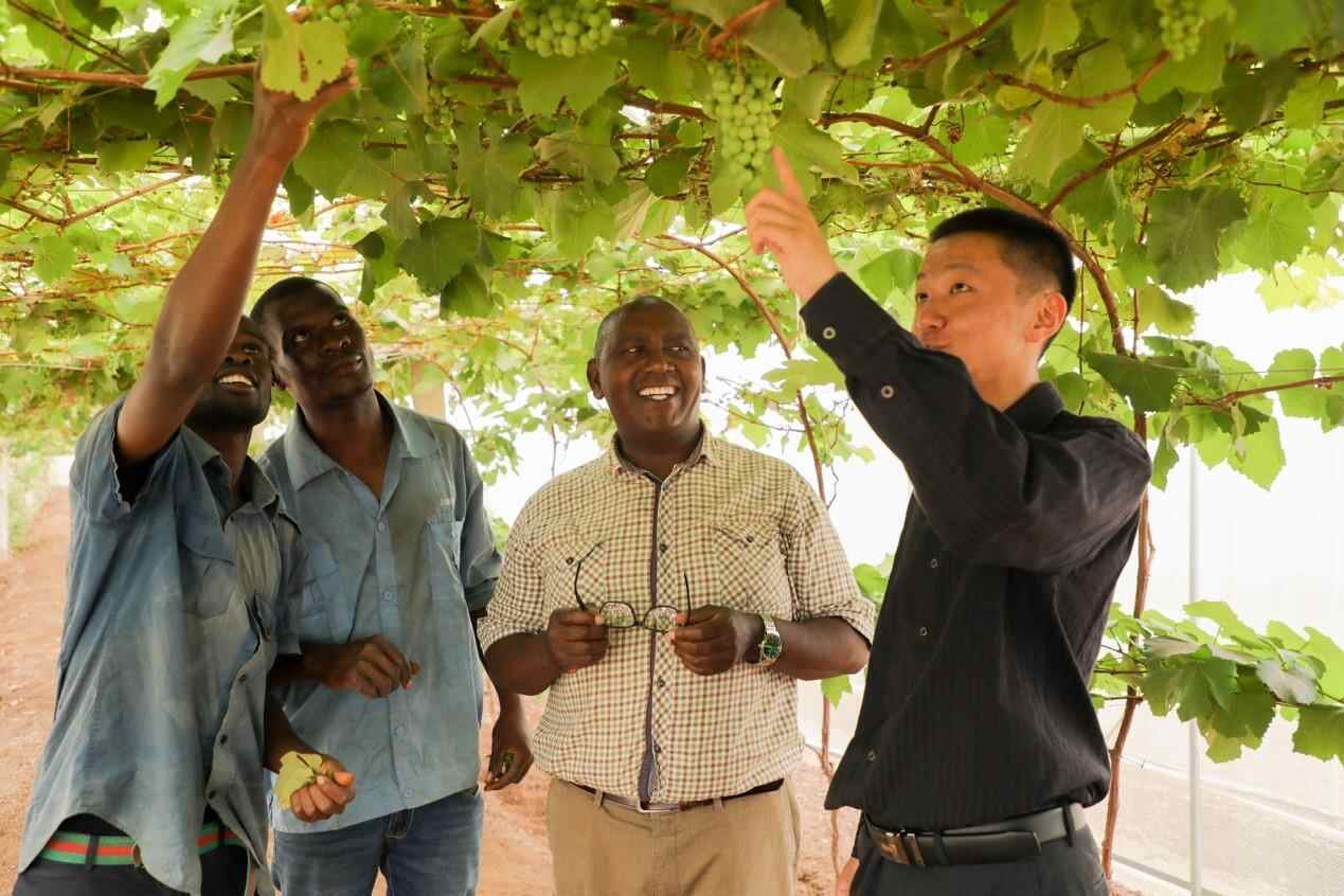△中国与非洲农业专家查看葡萄生长情况