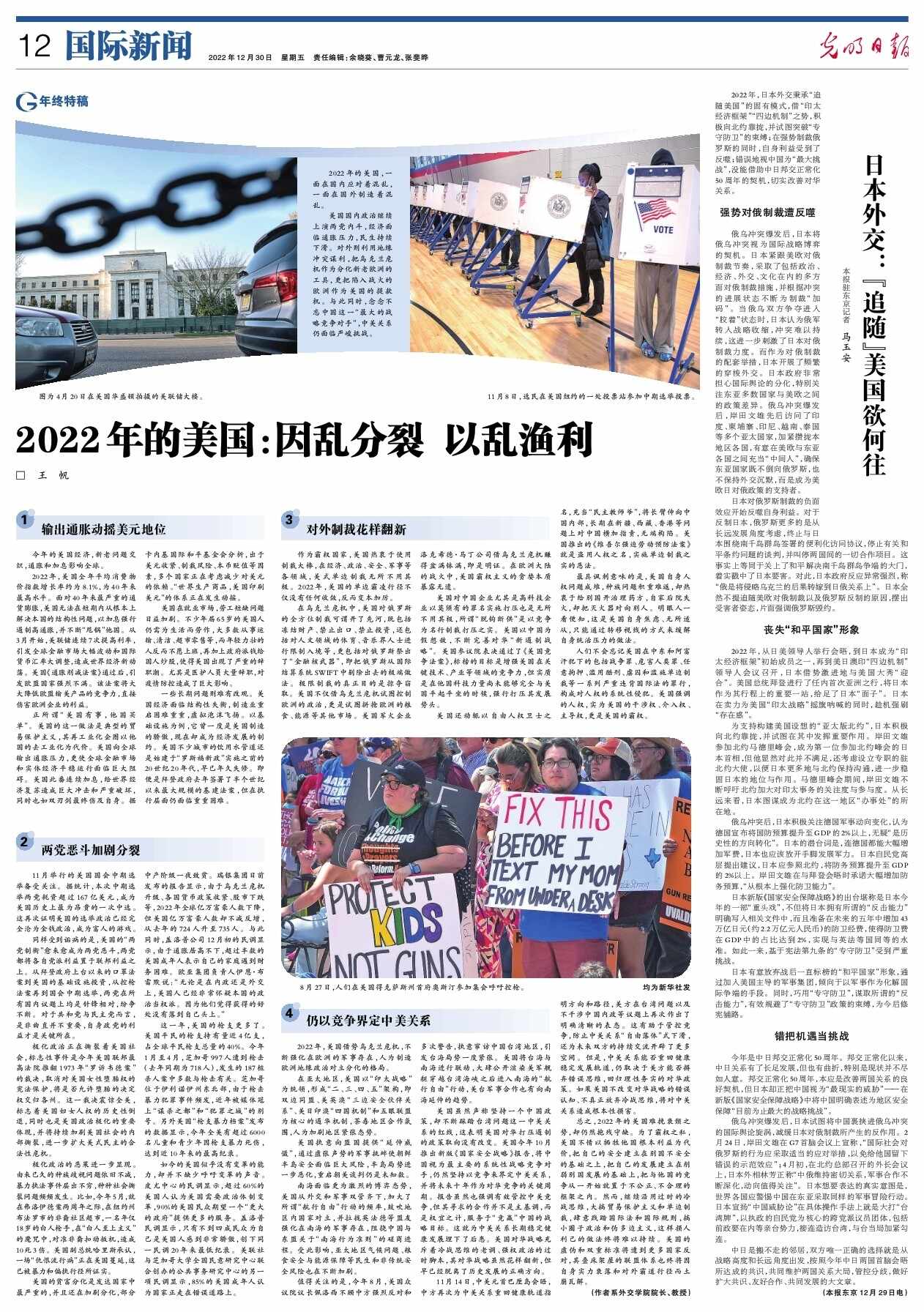 总之,2022年的美国难挽衰颓之势,却仍然抱残守缺。为了霸权之私,美国不惜以牺牲他国根本利益为代价,把自己的安全建立在别国不安全的基础之上,把自己的发展建立在削弱别国发展的基础上,把与他国的竞争从一开始就置于不公正、不合理的框架之内。然而,继续沿用过时的冷战思维,大搞贸易保护主义和单边制裁,肆意践踏国际法和国际规则,搞小圈子政治和伪多边主义,这样损人利己的做法终将难以持续。美国的虚伪和双重标准将遭到更多国家反对,其叠床架屋的联盟体系也终将因自身实力衰落和对外霸道行径而土崩瓦解。