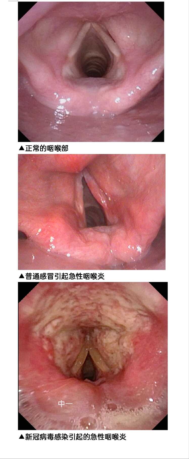 据中山一院喉镜室巫戍美医生介绍,电子喉镜下经常见到普通感冒引起的急性咽喉炎,多表现为咽喉粘膜局部充血水肿,但新冠引起的急性咽喉炎外观明显不同,表现为咽喉粘膜广泛水肿,渗出物明显增多和散在溃疡点,声带水肿,活动受限,出现“刀片喉”“宝娟嗓”就不奇怪了。