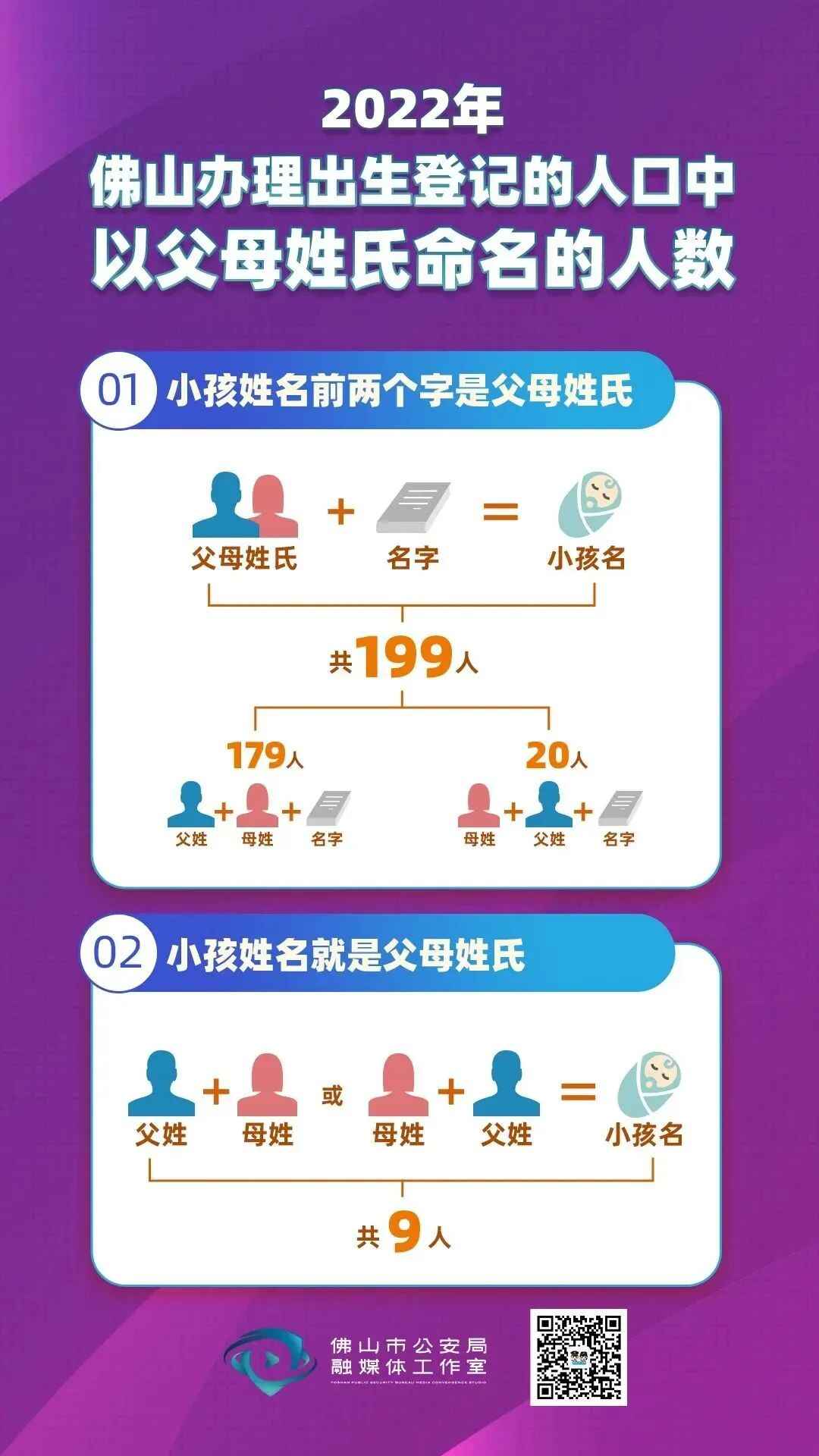 2022年,在佛山办理出生登记的人口中,小孩姓名前两个字是父母姓氏的共有199人。其中父姓+母姓的有179人,母姓+父姓的有20人。小孩姓名就是父姓+母姓或母姓+父姓的共有9人。