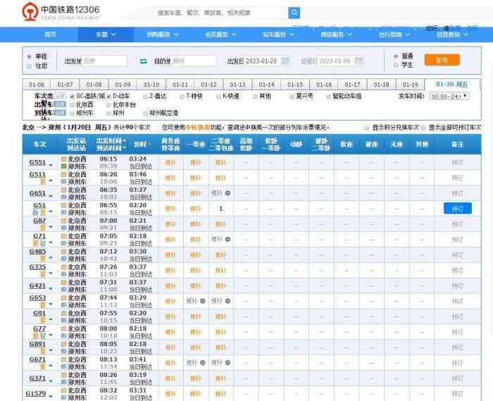 1月6日下午,记者查询12306网站发现,不少热门线路的火车票已经售罄。如,1月20日(腊月二十九)当天北京至郑州的高铁/动车车票只剩极少数车次还有余票,商务座、一等座也被抢购一空,K字头、Z字头等列车车票也几乎售罄;北京至武汉的高铁/动车余票也所剩无几。
