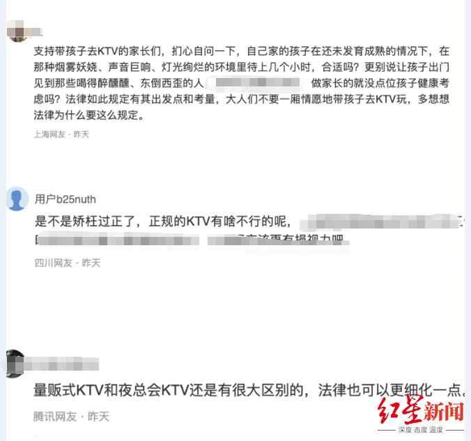 对于这一规定,有网友表示,支持禁止未成年人去酒吧喝酒、去不正规的会所,但是没必要禁止未成年人去正规的KTV,“只是一个唱歌的地方”。不少家长也表示,并不知道带孩子去KTV是被禁止的。也有家长纳闷,家里孩子喜欢唱歌,“有家长陪同,应该不会有什么不好的影响吧?”