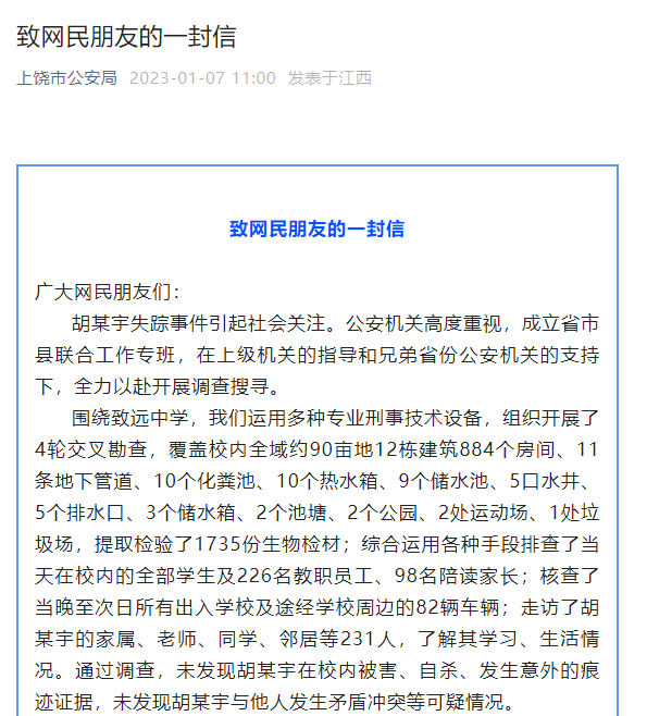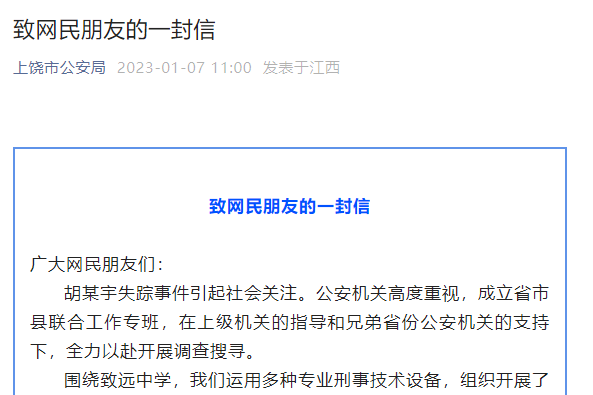 今天(1月7日),上饶市公安局发布《致网民朋友的一封信》,回应胡某宇失踪事件家属、网民关注的重点人员和质疑的重点问题。以下为全文: