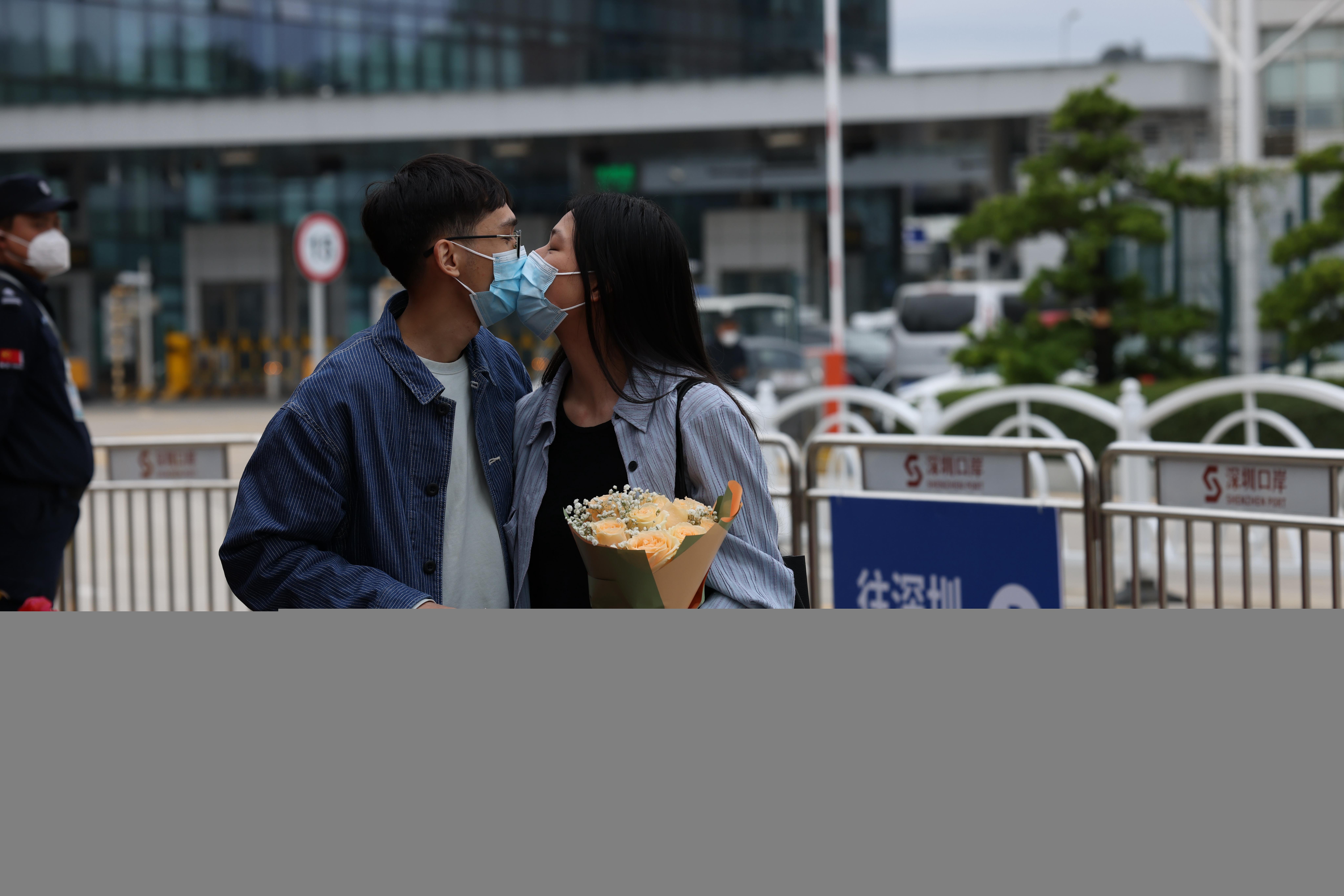 香港市民唐小姐一步出福田口岸,在关口久候多时的男友刘先生就马上向她送上一束玫瑰花,连人带花把女友深深拥抱。唐小姐说,两人是大学同学,交往两年,因疫情分隔异地,一通关就能见面,十分开心。问及有什么想与唐小姐说,刘先生笑答,“我们不需要讲话”,一切尽在心中。