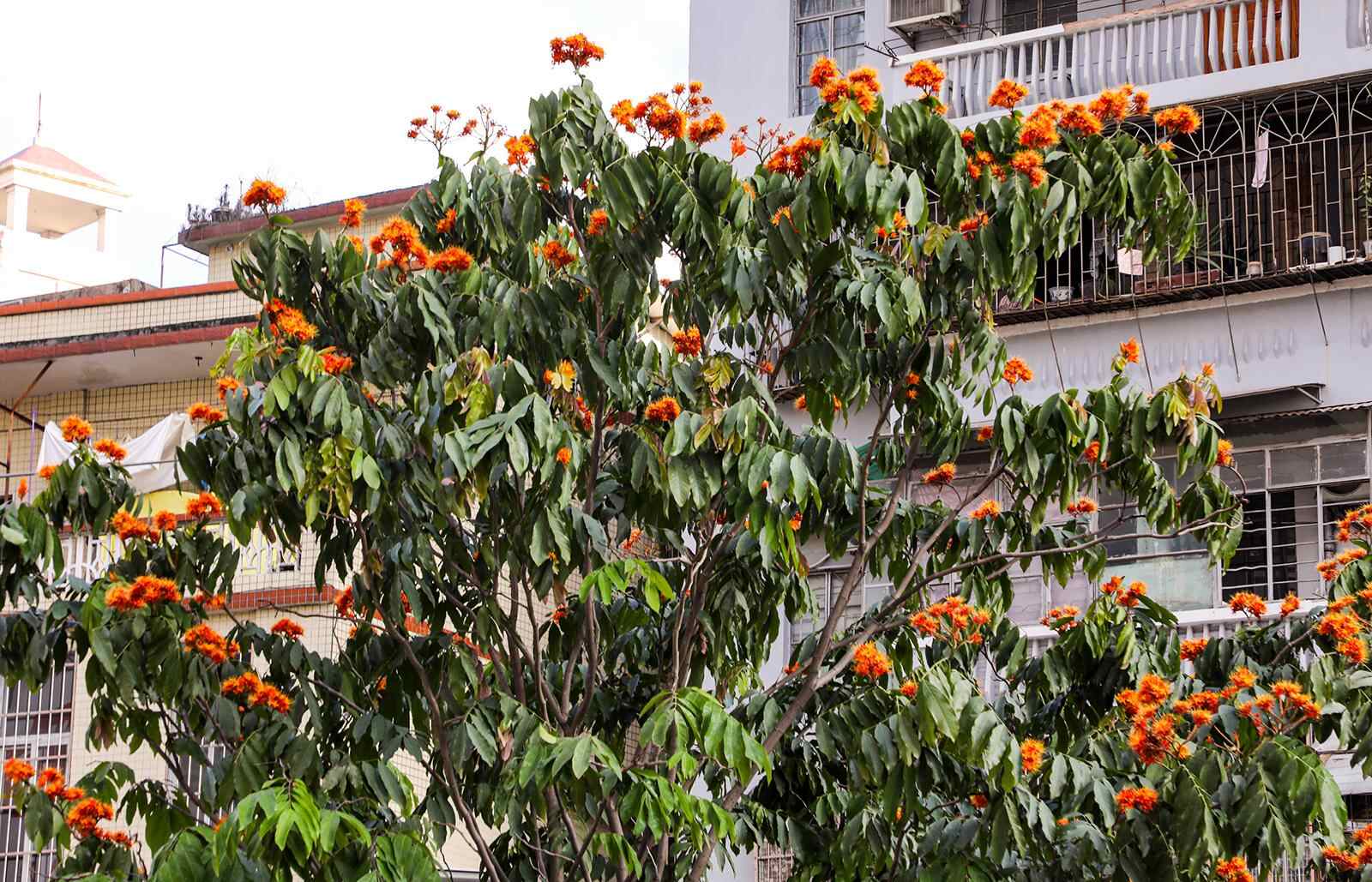 在越秀区万福路(靠近北京路),有一株无忧树,已开红花几十朵,给新春的来临,带来温暖和快乐。这株无忧树,是21世纪首次在“冬至”节气开花,十分惹人注目。