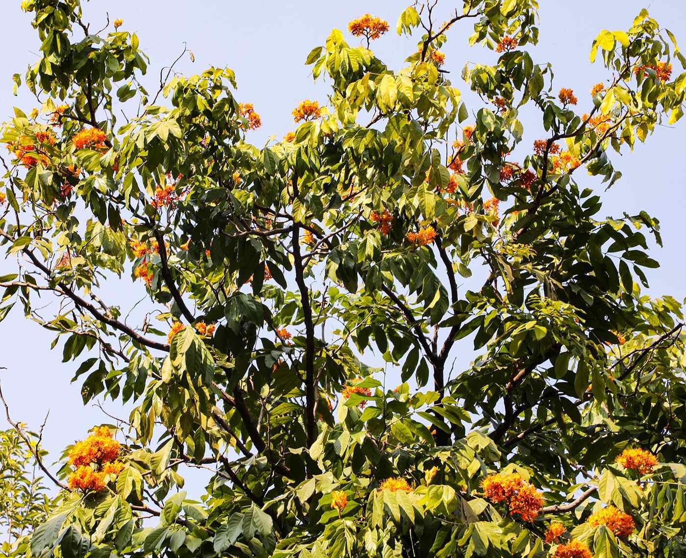 无独有偶,好事成双。在广州文化公园大门内(荔湾区西堤二马路),也有一株高大的无忧树,迎着朔风怒放繁花。