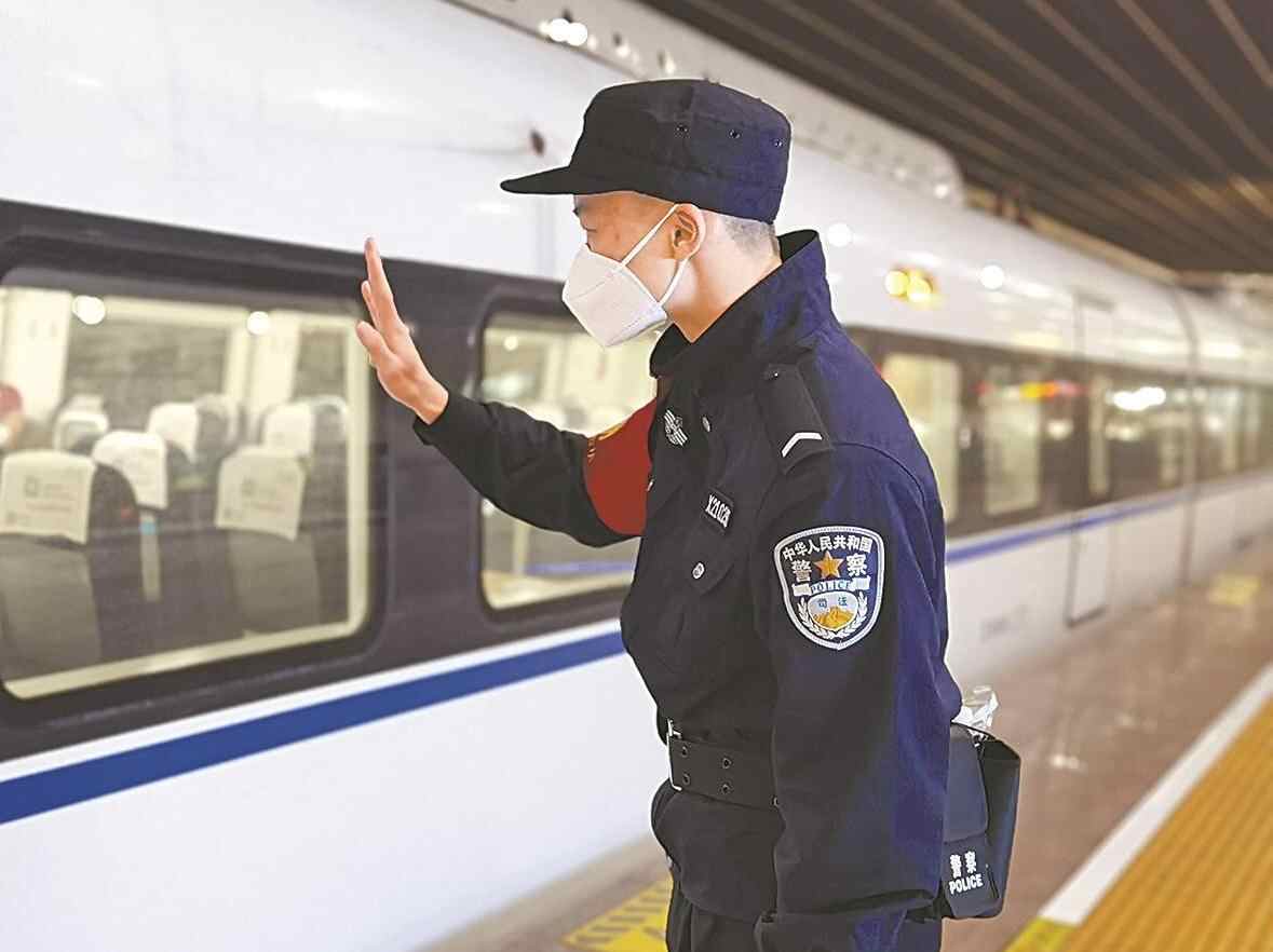 1月10日凌晨,在广州南站23号站台上,参加春运值班的预备警官小黄向即将离开的列车中小朋友挥手道别。这是他第一次参加春运值班工作,他说这也是自己最难忘的一次,因为今天是中国人民警察节,他在岗位上度过了属于自己的节日 羊城晚报全媒体记者 刘颖颖 摄