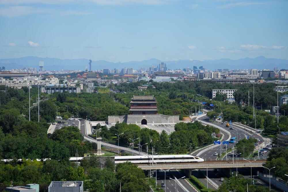 一列复兴号列车从北京永定门城楼前驶过(2022年8月16日摄)。新华社记者 鞠焕宗 摄