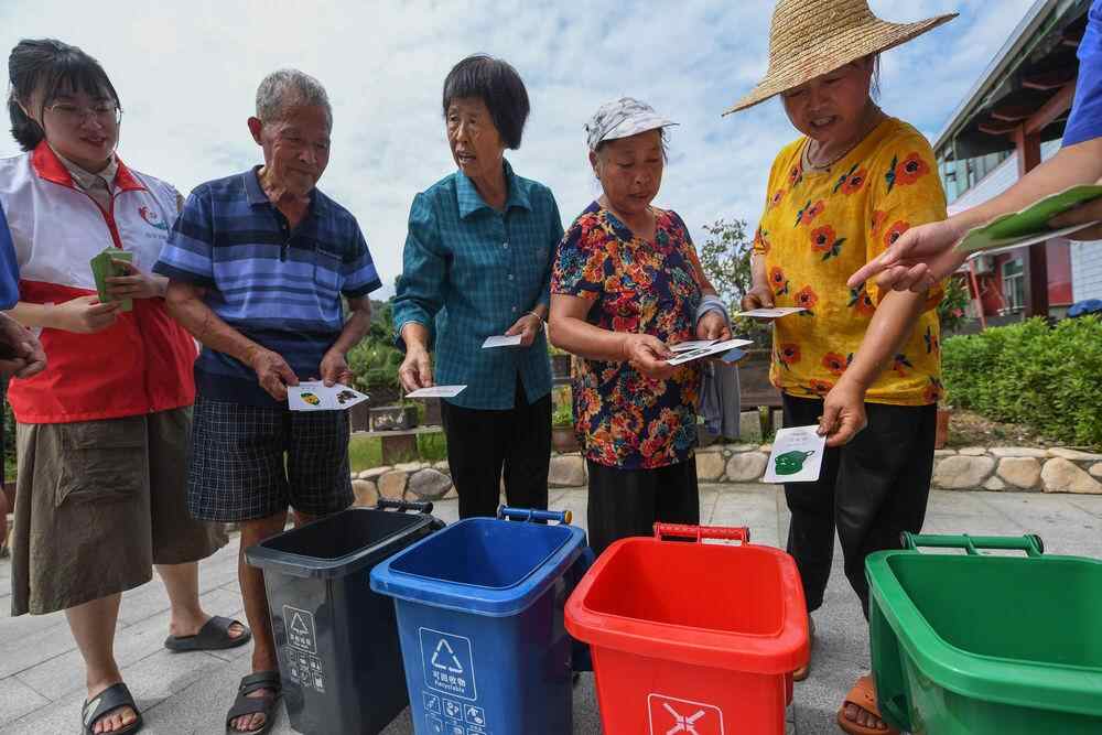 浙江省杭州市临安区龙岗镇的村民们参加垃圾分类小游戏,学习垃圾分类知识(2021年9月16日摄)。新华社记者 徐昱 摄