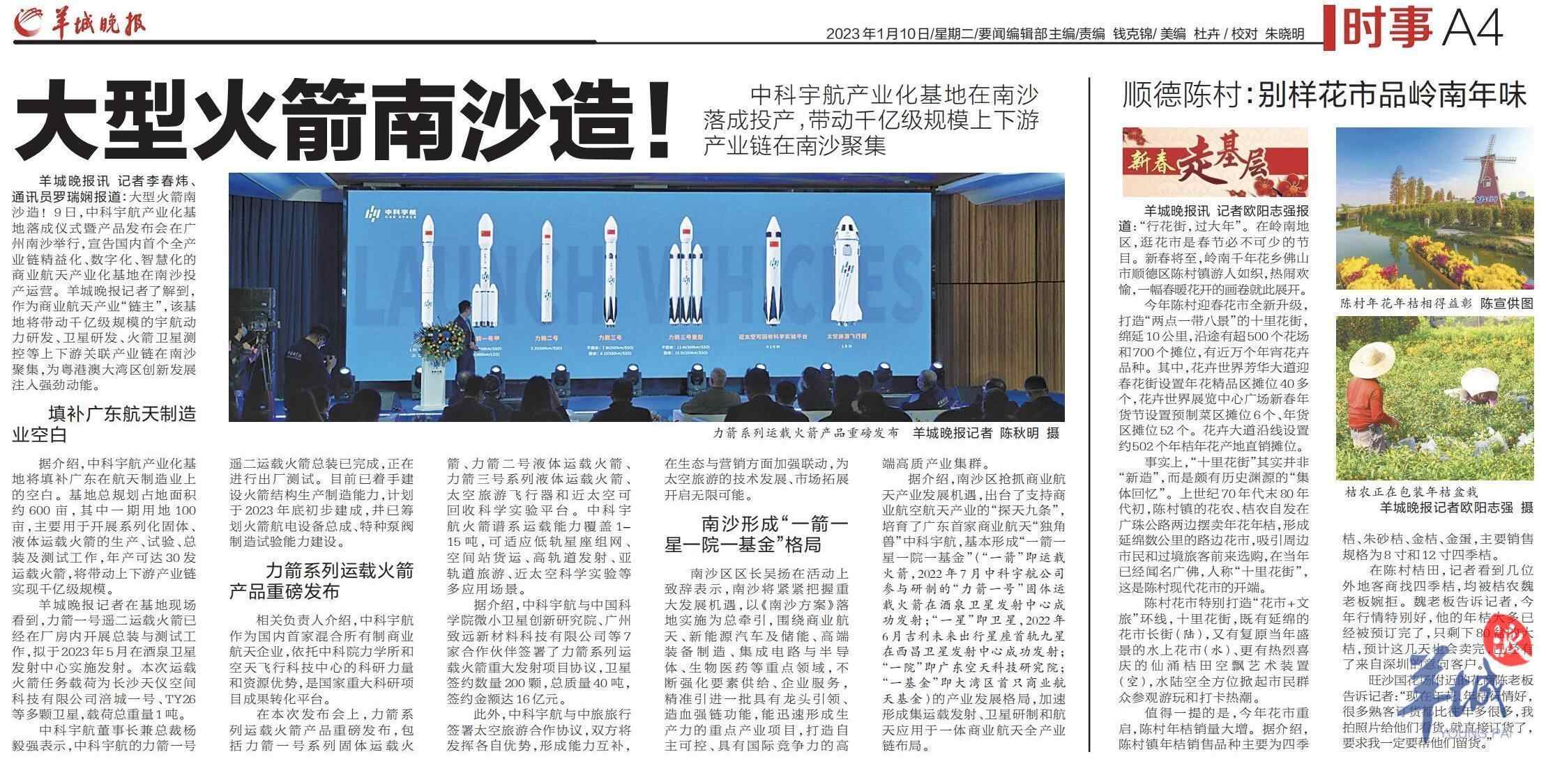 1月9日,中科宇航产业化基地落成仪式暨产品发布会在广州南沙举行,宣告国内首个全产业链精益化、数字化、智慧化的商业航天产业化基地在南沙投产运营。羊城晚报全媒体记者了解到,作为商业航天产业“链主”,该基地将带动千亿级规模的宇航动力研发、卫星研发、火箭卫星测控等上下游关联产业链在南沙聚集,为粤港澳大湾区创新发展注入强劲动能。