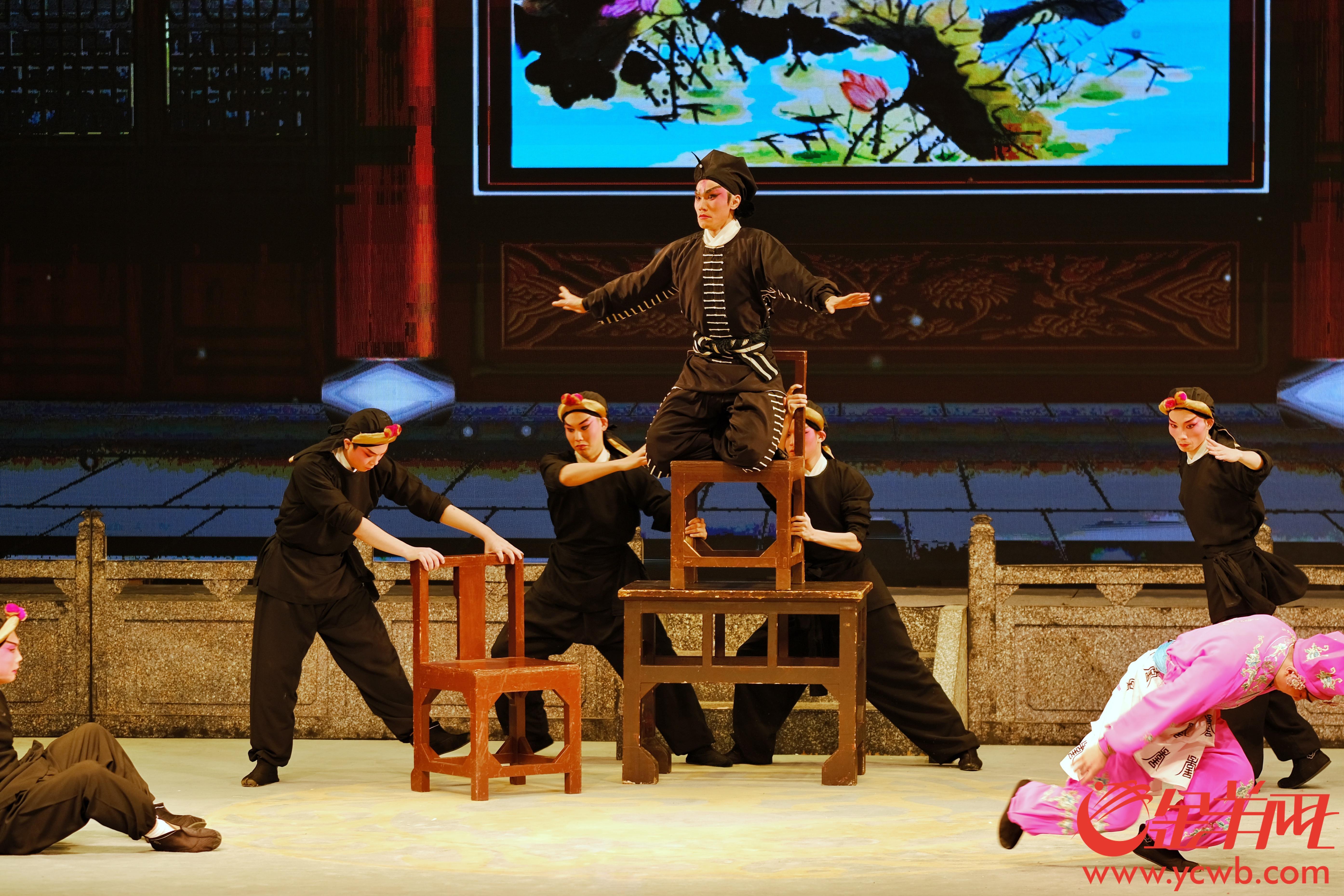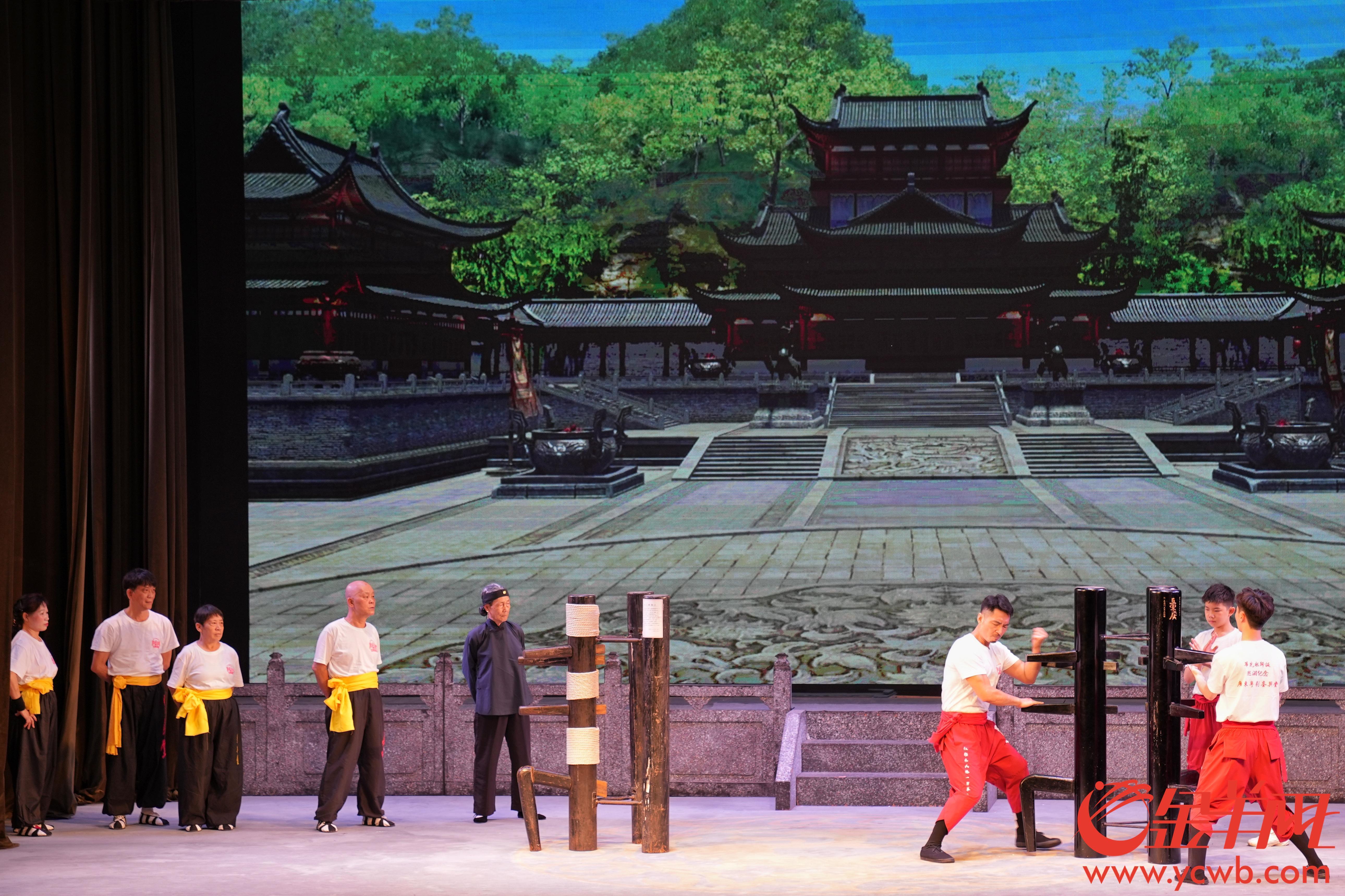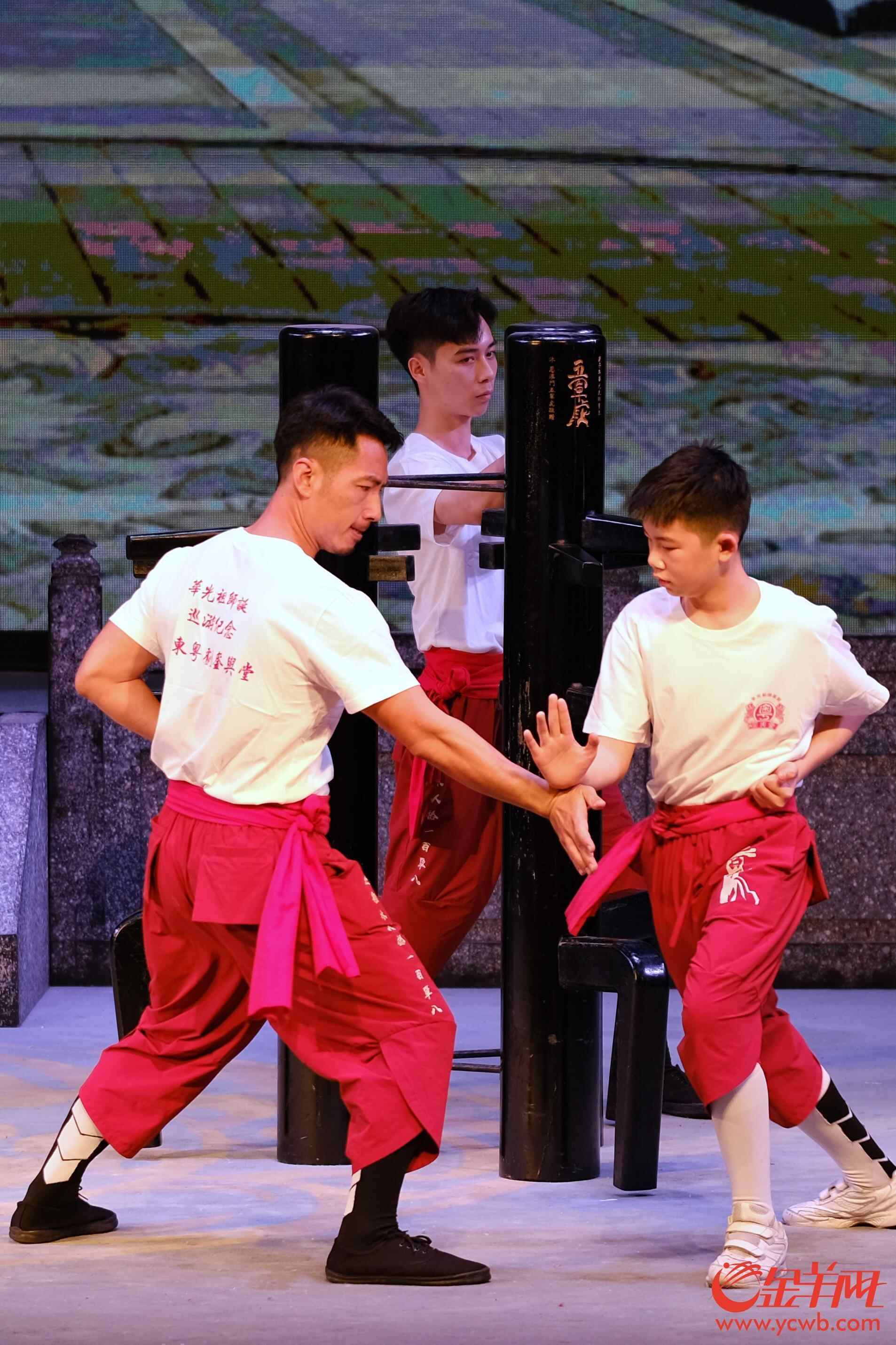澳门的李健豪与八和子弟进行《粤剧红船木人桩108式》展演,展现粤剧红船木人桩以桩身、桩手、桩脚,演绎一百零八式招式,创造出“天王托塔” “霸王夜宴”形态。