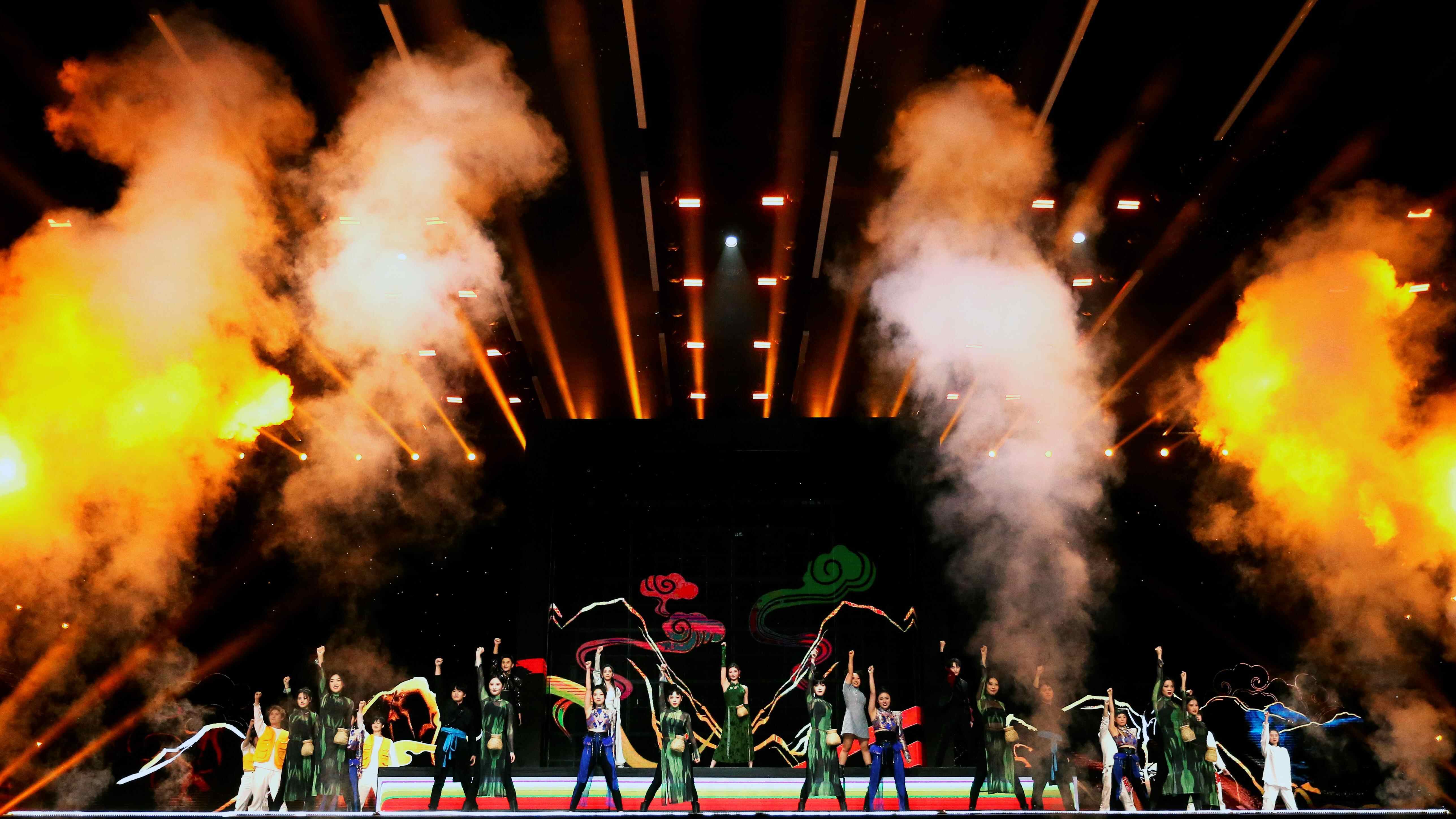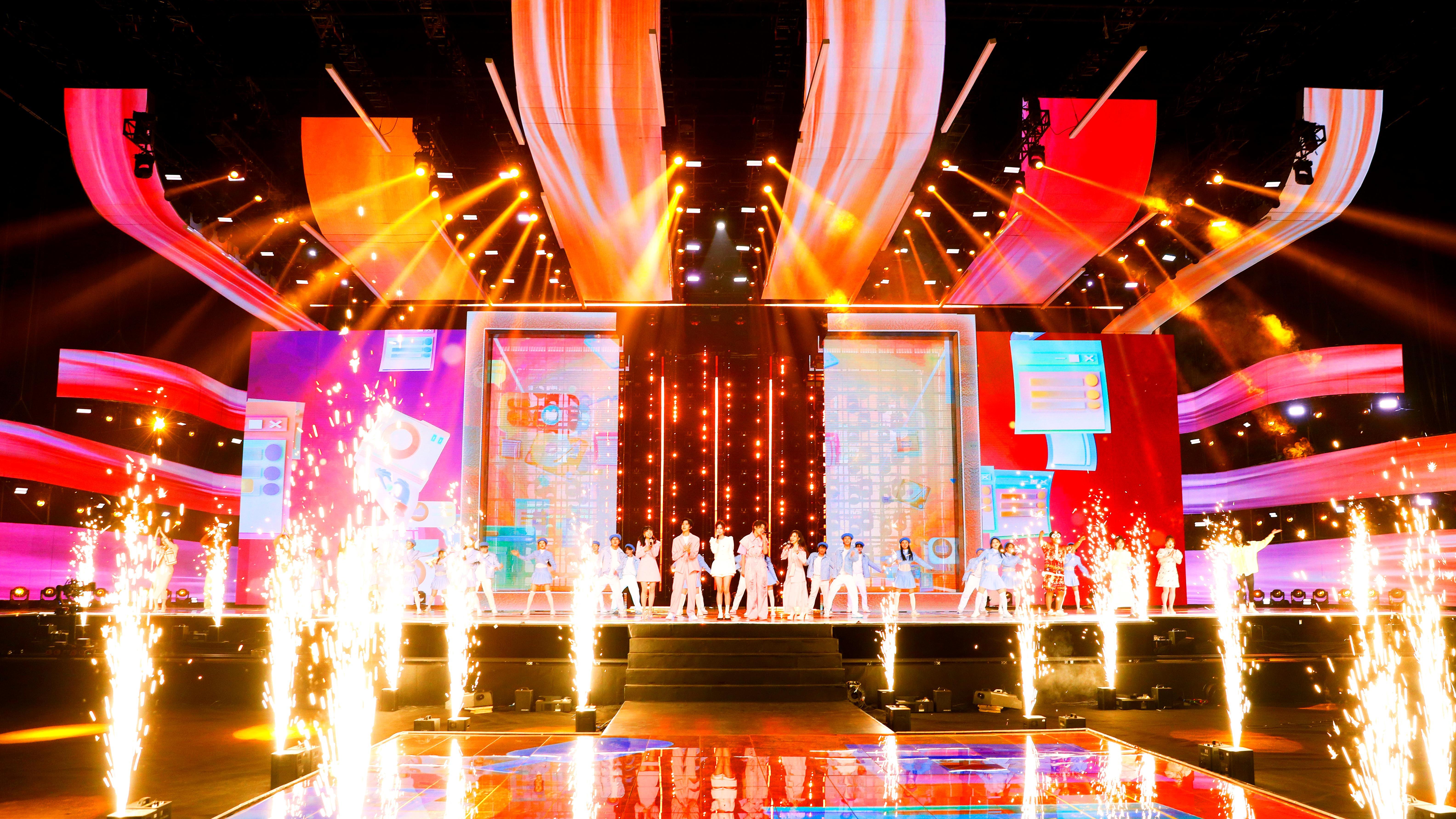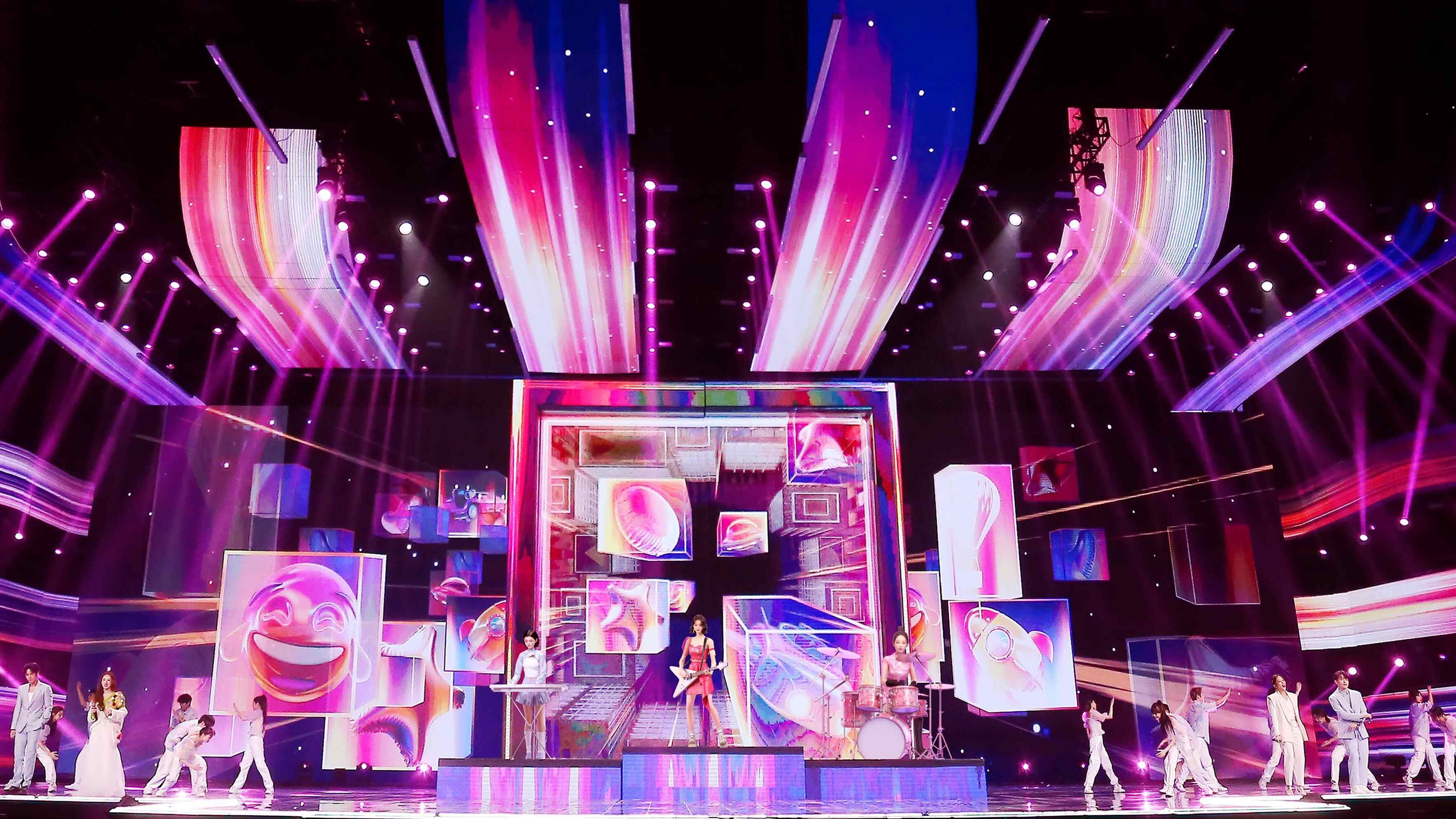 开场秀《开新无限》中,舞台变身大型“视频通话”现场,多名青年歌手、音乐人,与来自美食、美妆、旅行、健身等不同领域的博主依次亮相,充满科技感的舞台模块组合变换,为“开新”狂欢热情开场。