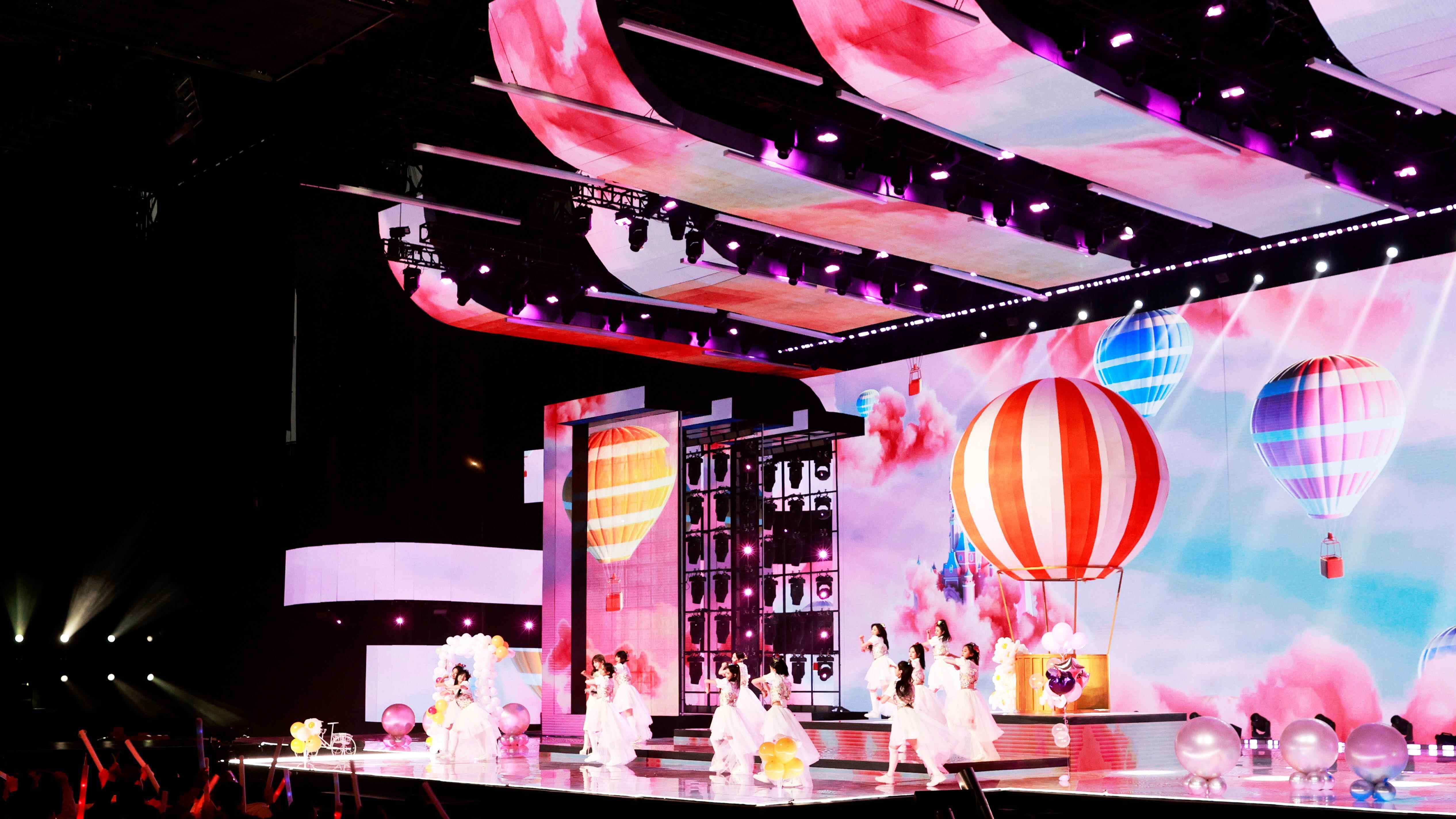 本届网晚舞美以“开新图鉴”为概念,开放式的舞台空间传递出青年群体放声表达、昂扬向上的精神风貌,结合舞台升降装置、超宽幅开合屏、数控放射灯阵等打造沉浸舞台,带来奇幻的视觉体验。