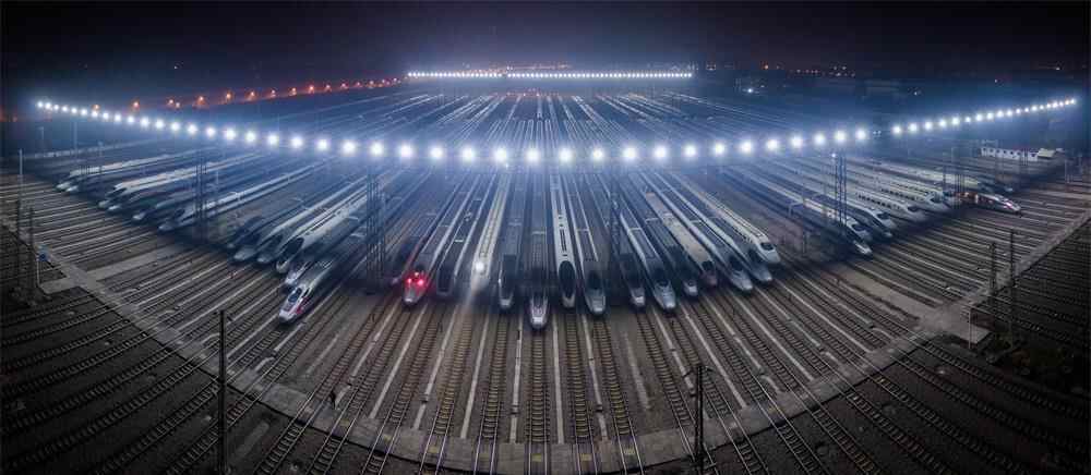 1月7日凌晨,动车组列车停靠在武汉动车段的存车线上(无人机拼接照片)。新华社记者 伍志尊 摄