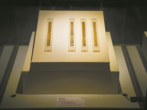 记者在展览现场还看到,展柜中的木简都被“封闭”在有机玻璃盒子里。在灯光的照射下,木简表面银光点点,如同撒了一层银粉。这难道是木简自带的“光芒”?南越王博物院副院长李灶新对此解释说,这些木简都是在经历了发现、提取、清洗、保护等一系列流程后才得以公开展示。在保护中,工作人员对木简进行脱水。水分被抽走后,木简会变形,比如缩短、压扁等,而需要注射一些凝固物质进去,达到没脱水之前的平衡。“这就如同给人美容时注射玻尿酸等填充物,凝固物质中含有一些化学物质等,闪光的点点就源自这些保护材质。”李灶新说。