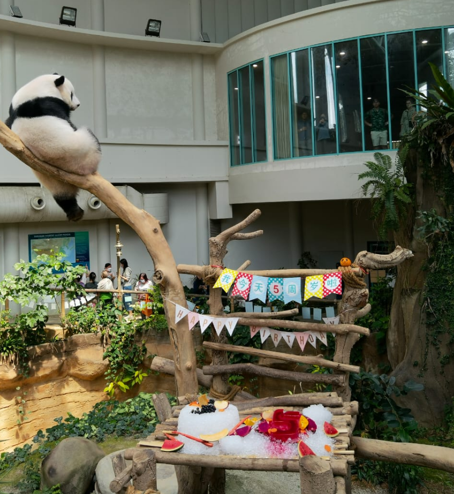 当地时间1月14日上午,马来西亚国家动物园为大熊猫“谊谊”庆祝5岁生日。熊猫保育馆为“谊谊”准备了丰盛的生日宴。