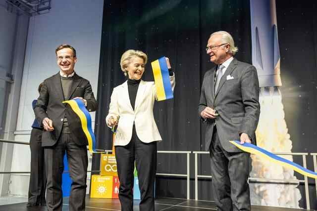1月13日,在瑞典北部城市基律纳,瑞典国王卡尔十六世·古斯塔夫(右)、瑞典首相克里斯特松(左)与到访的欧盟委员会主席冯德莱恩(中)出席航天港落成典礼并剪彩。