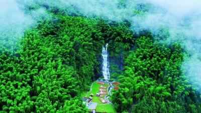 穿行于宜春城西南的明月山南麓,只见一路层峦叠翠,这里的万顷竹海郁郁葱葱,山中空气负氧离子含量高达7万多个/立方厘米,是国家标准的35倍,堪称“天然氧吧”。