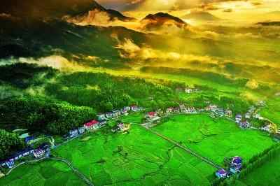 朝霞洒满靖安县官庄镇哨前村,与田野的绿碰撞交融,美如画卷。胡瑞森摄