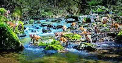 野生猕猴群在宜春官山国家级自然保护区内玩耍嬉戏。姚晓勇摄