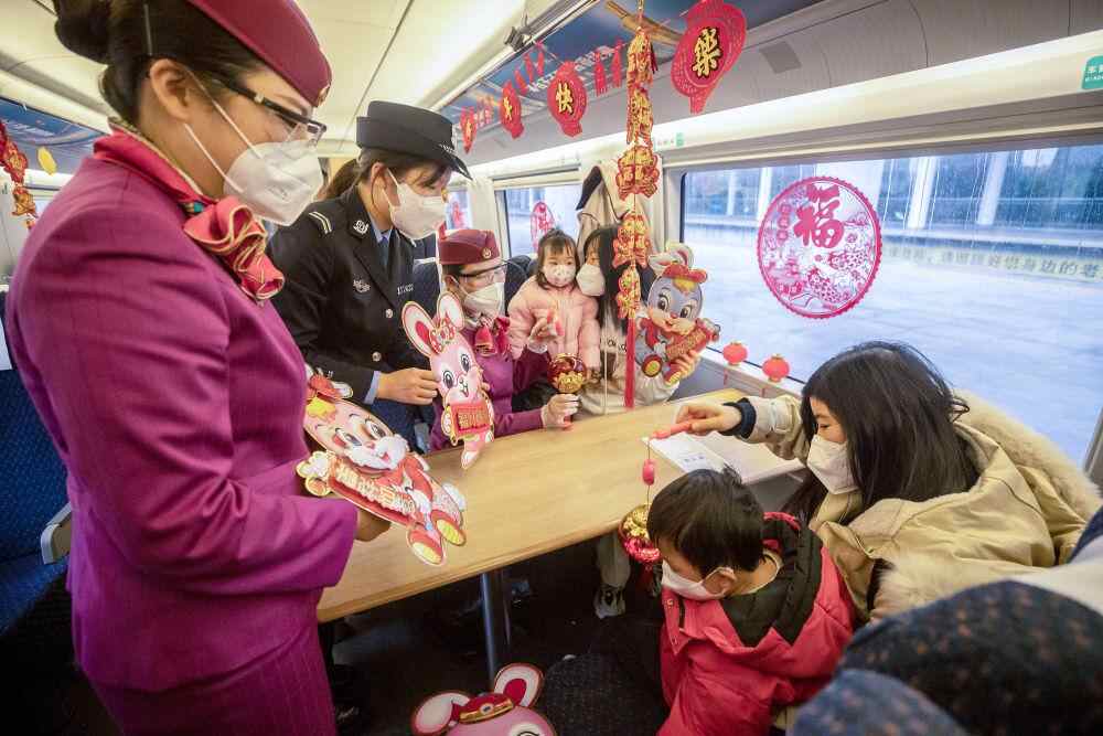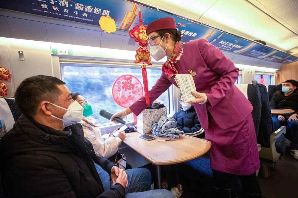 1月14日,重庆客运段联合重庆公安处民警为旅客分发兔年纪念品。