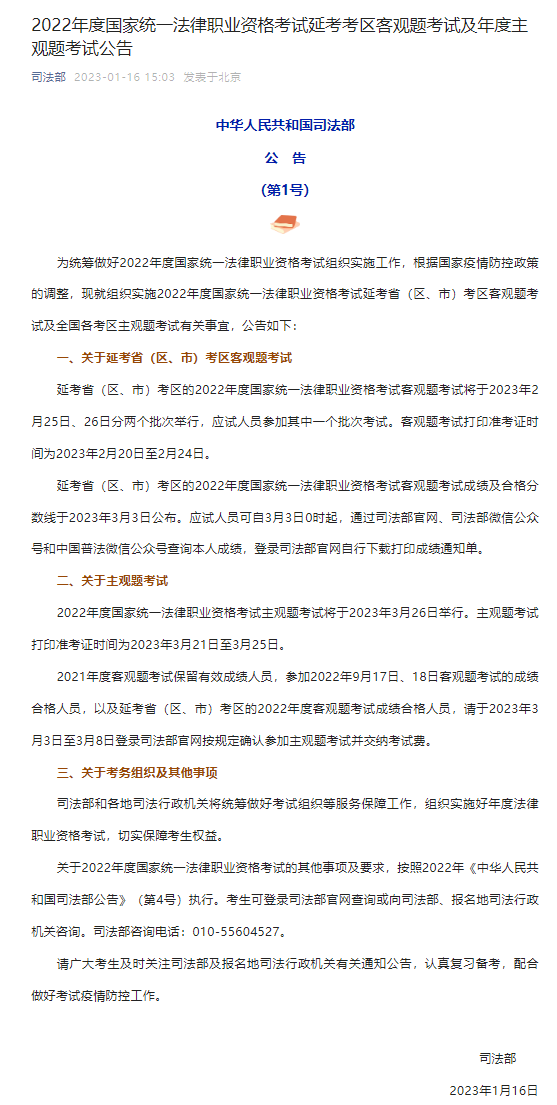 司法部微信公众号16日发布《2022年度国家统一法律职业资格考试延考考区客观题考试及年度主观题考试公告》:延考省(区、市)考区的2022年度国家统一法律职业资格考试客观题考试将于2023年2月25日、26日分两个批次举行,应试人员参加其中一个批次考试。2022年度国家统一法律职业资格考试主观题考试将于2023年3月26日举行。