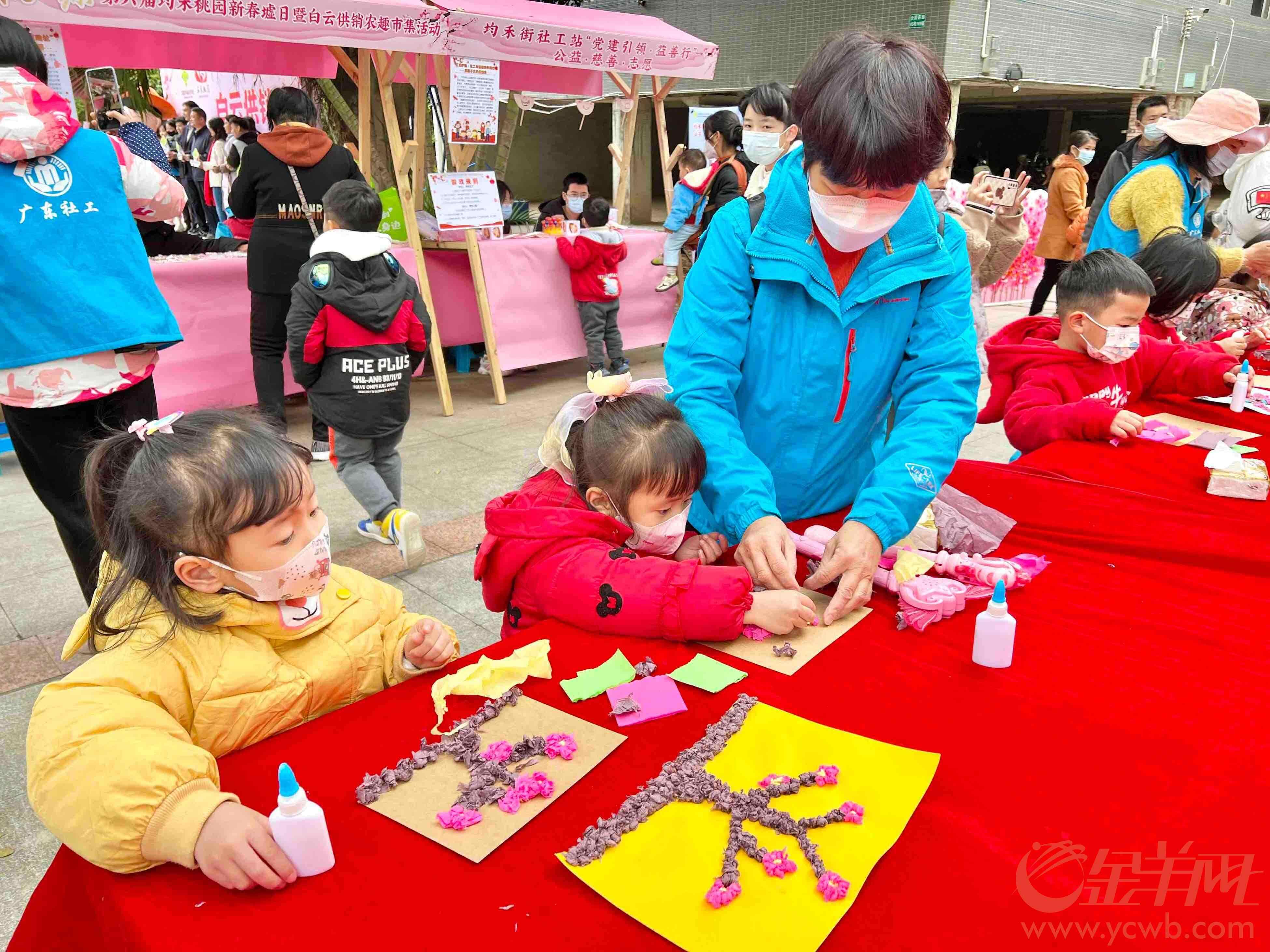 当天,60岁的杨姨带着两个外孙一起来趁墟。“我就是均禾本地人,以前也参加过桃园新春墟日活动,受疫情影响活动线下停办了两年,今年终于又重启了,我在群里看到消息后,今天专门带小朋友来玩一下。”杨姨说,7岁的外孙在手工体验区用彩色皱纹纸拼了一幅桃花图,玩得非常开心。“看到现场这么热闹,一下就有了过年的气氛。新的一年,希望大家身体健康,恢复正常生活。”她说。
