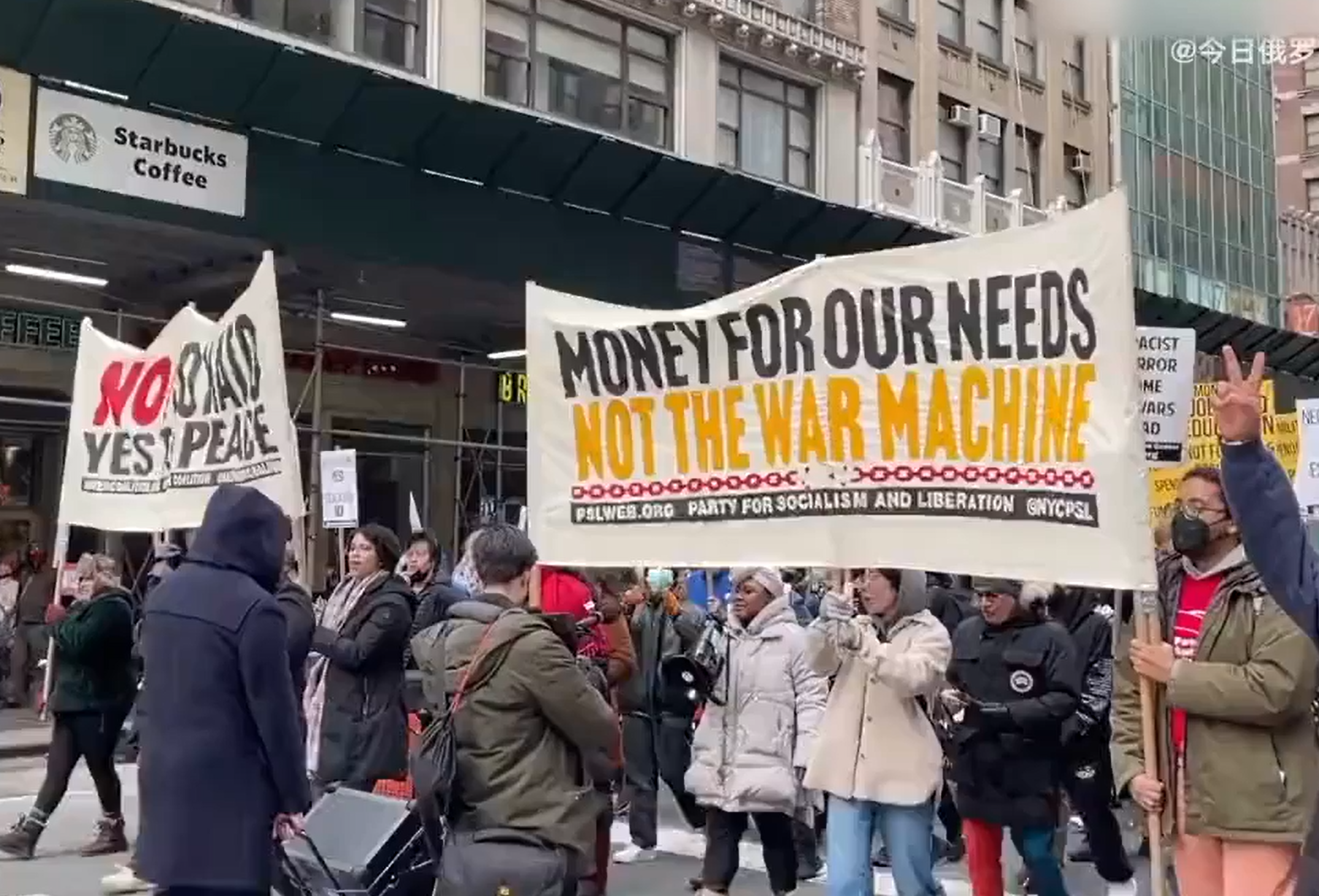 近日,美国数千名抗议者冒着严寒,聚集在纽约时报广场,他们举着“解散北约”横幅,高喊口号,要求政府解决国内问题,停止干涉别国事务。