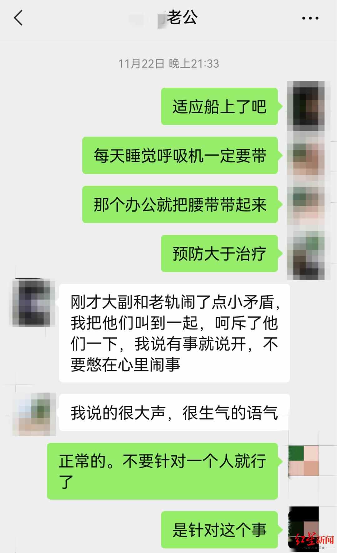 申女士的怀疑来自于丈夫和她的聊天内容,“只要船上有信号,每天我们都会聊聊他的工作以及家里的事。”而此次李磊登船后第10天,她就收到了丈夫一些关于人事工作上的抱怨。