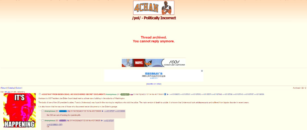 网传“拜登助手死亡”的说法来自一家叫4chan的贴图论坛网站。北京时间1月14日下午5时01分,ID名为ANuMja9a的4chan用户在该平台的“政治不正确”版块发布了一则帖子,称“拜登的助手死亡,他发现了秘密文件”,并为该说法配上了一张带有“正在进行中”文字的表情包。