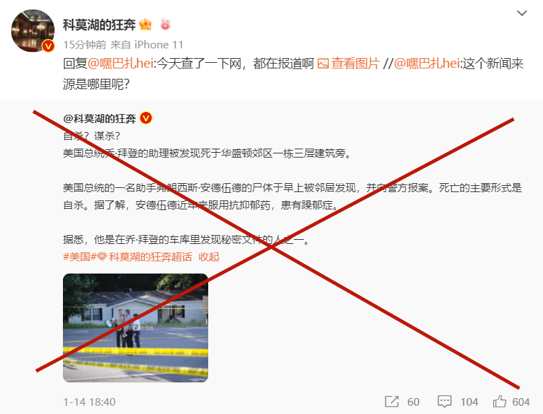 尽管目前无法确认,ANuMja9a发布“拜登助手死亡”的消息是否有讽刺的目的,但从已有信息可知,这一消息并无实证。