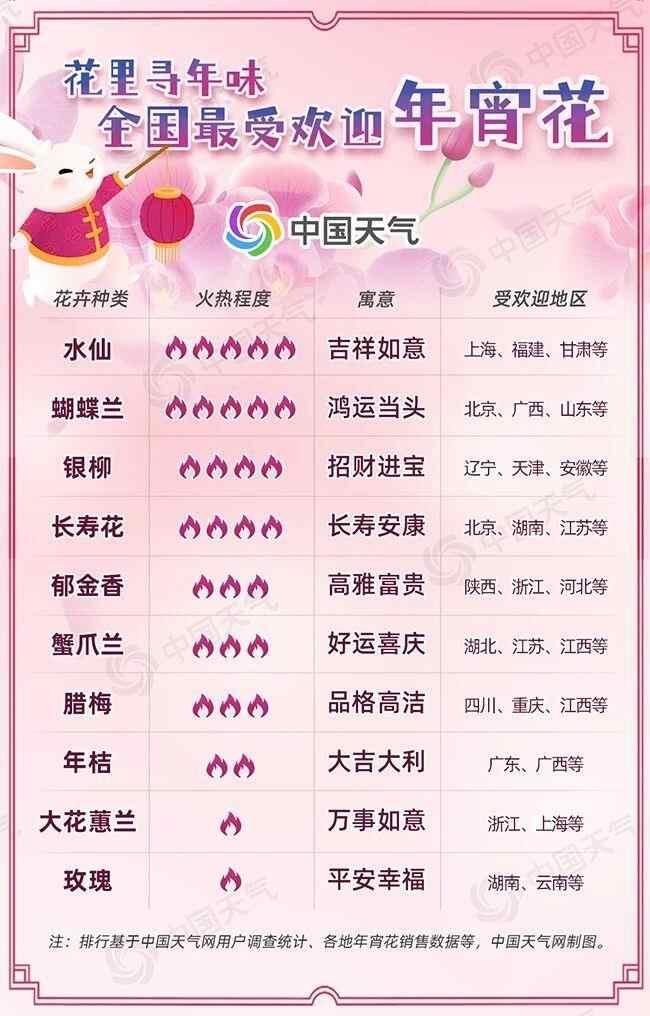 人间烟火色,最是新春时。俗话说无花不成年,年宵花可谓是年味气氛组的担当,既能给家里增添节日的喜庆气氛,也寓意着新年有个好彩头。蝴蝶兰、水仙花、长寿花……你家过年都爱买什么花?中国天气网推出年宵花最受欢迎排行榜,看看大江南北年宵花偏好有何不同。