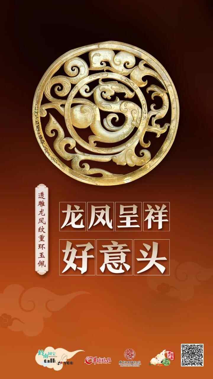 1983年,考古工作者在广东省广州市发现一座南越大墓,墓主人是公元前122年去世的南越国文王赵眜。在他的右眼处,出土了一块精美的透雕龙凤纹重环玉佩,分隔为内外两圈。内圈透雕一游龙,外圈透雕一凤鸟,立于龙爪之上,凤冠和尾羽上下延伸成卷云纹。南越国是汉朝属国,汉朝以右为尊,这块被放置在文王右眼处的玉佩体现出当时最高水平的制作工艺,即使在今天,它的精致程度也令人赞不绝口。正因如此,这块玉佩被选为南越王博物院的院徽。