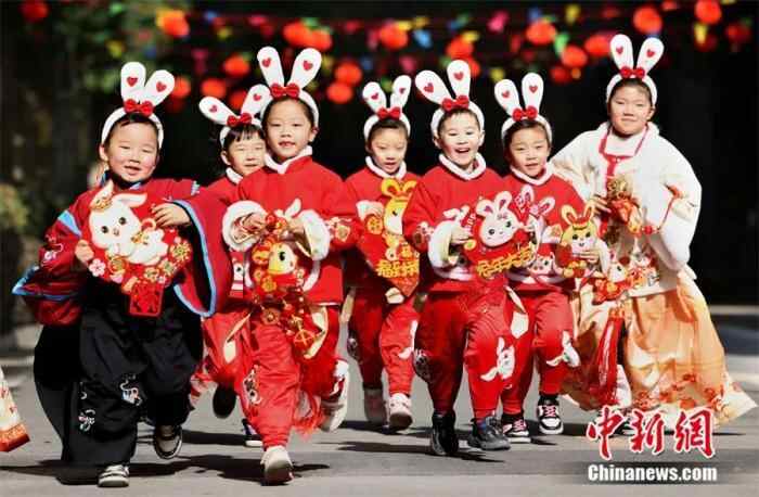 孩子们身穿兔年服饰迎接农历癸卯兔年。解琛 摄