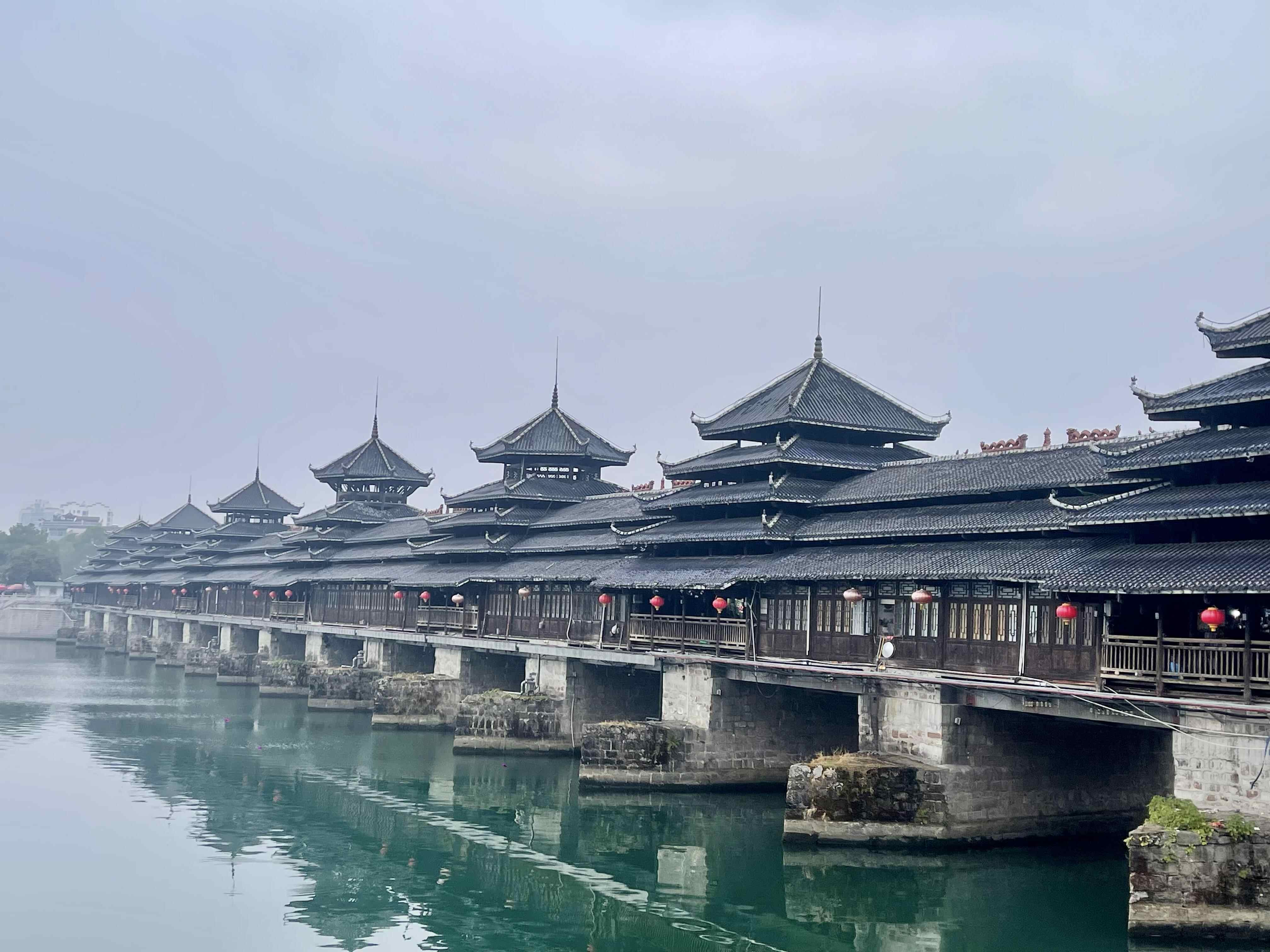 大年初二,芷江下起了小雨。烟雨迷蒙中,龙津风雨桥“若晴虹将饮,似游龙浮水”,横贯东西两岸,气势恢弘。深蓝色的琉璃瓦、6组金黄色的双龙抢宝、兽头和飞檐翘角等,处处展现着侗族建筑艺术的精妙。