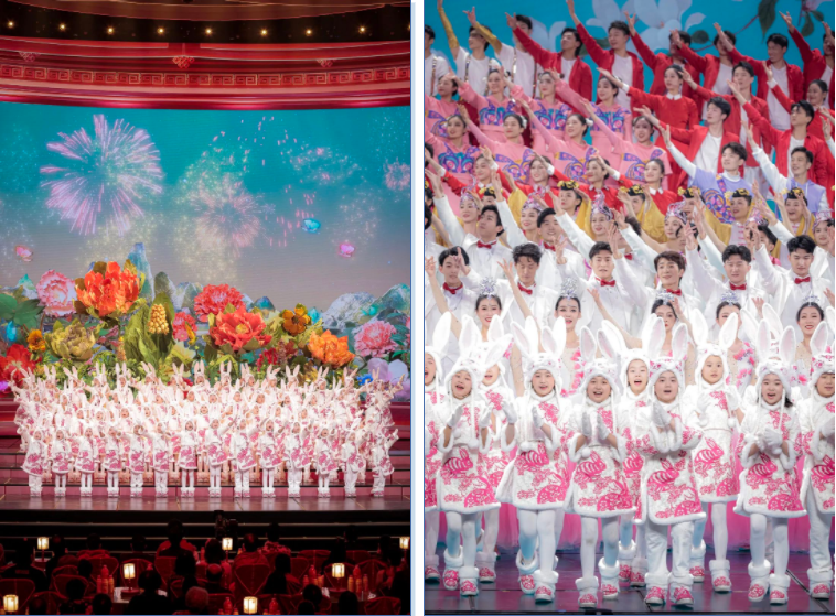 演唱这首歌曲的孩子们,一年前也曾在北京冬奥会开幕式上面对世界瞩目,唱响空灵澄澈的冰雪之歌。兔年来到,这群“小雪花”降落在总台春晚的舞台。穿上暖洋洋的兔子装,歌声似乎也会更加温暖,随着轻快的节奏摇摇摆摆,飞向万家灯火、浩瀚星海。